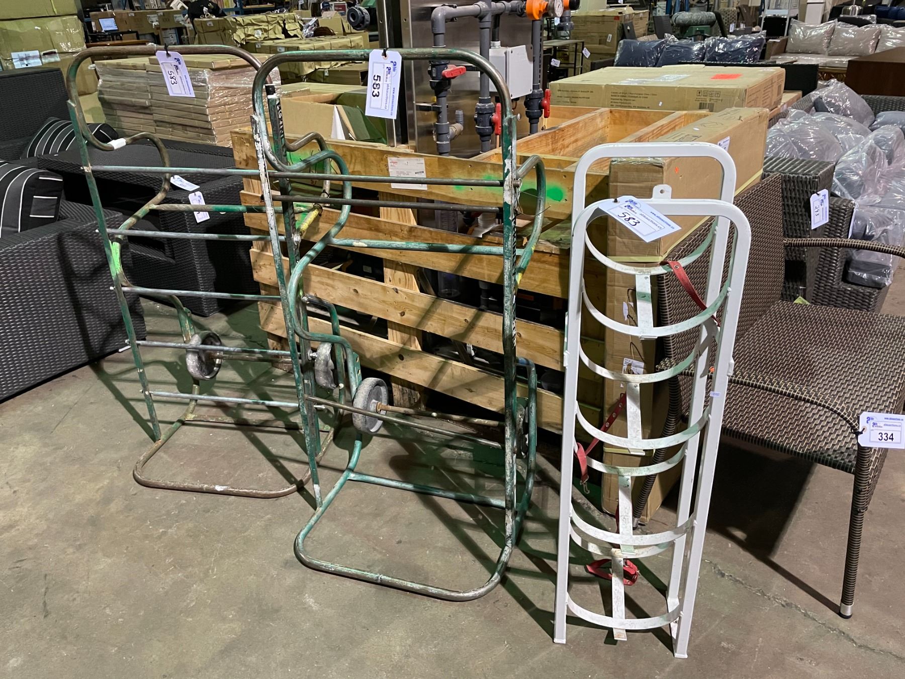 2 GREEN MOBILE WIRE CARTS & WHITE MOUNTABLE PROPANE BOTTLE RACK