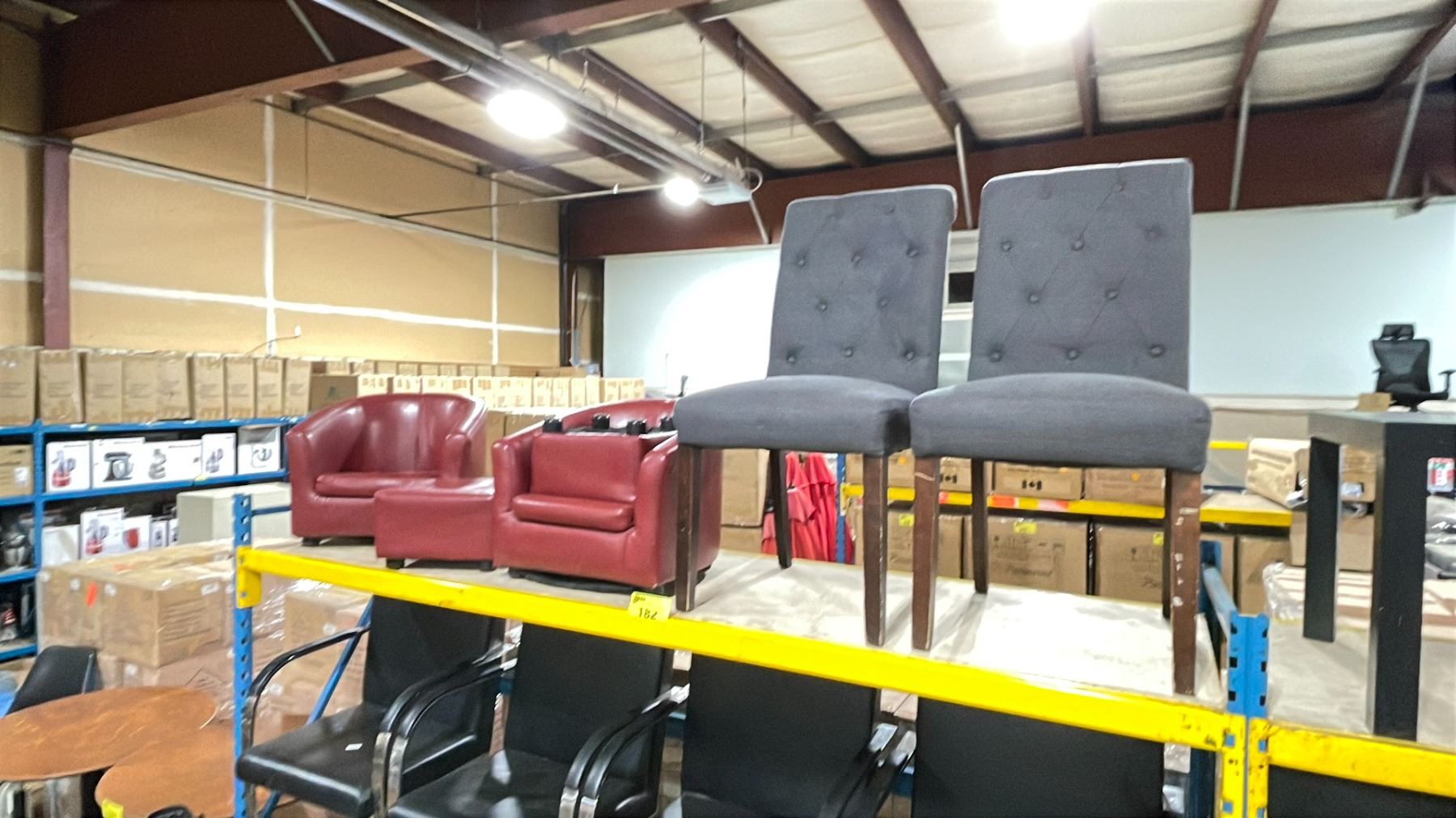 2 GREY PADDED RESTAURANT SIDE CHAIRS & 2 RED CHILDRENS TUB CHAIRS WITH OTTOMANS