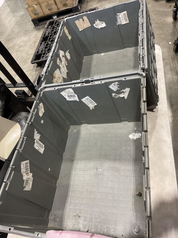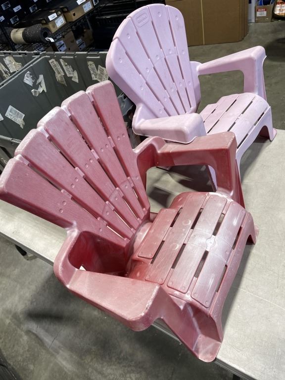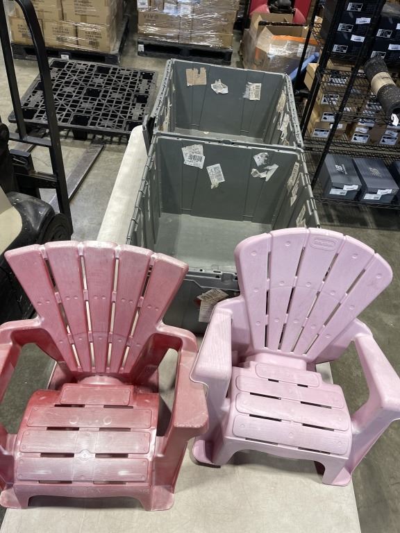 2 GREY STORAGE TOTES AND 2 PLASTIC KKIDS LAWN CHAIRS