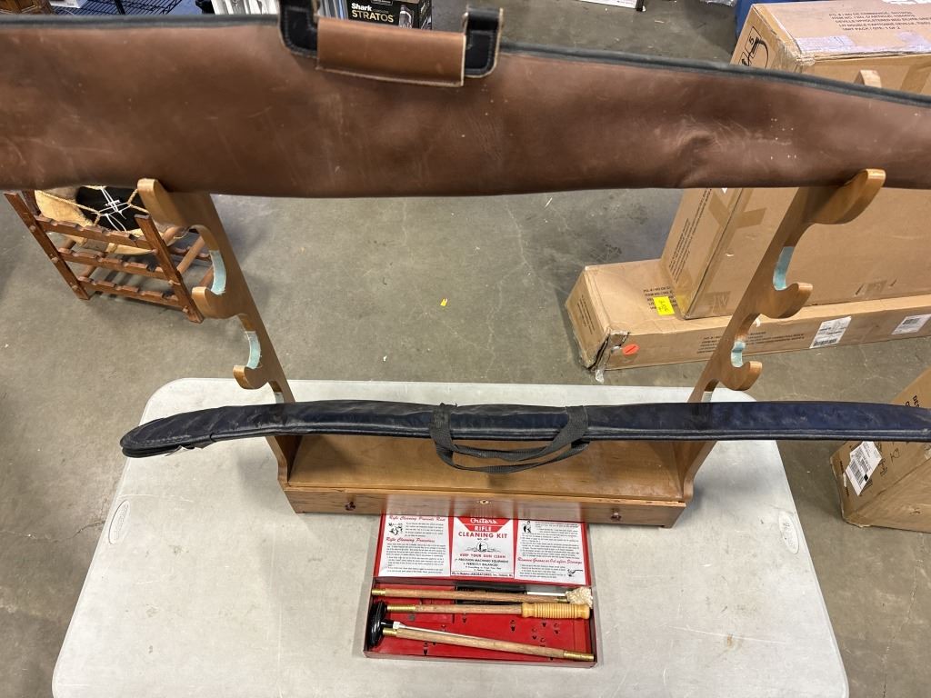2 GUN SLEEVES, WALL MOUNT GUN RACK AND GUN CLEANING KIT