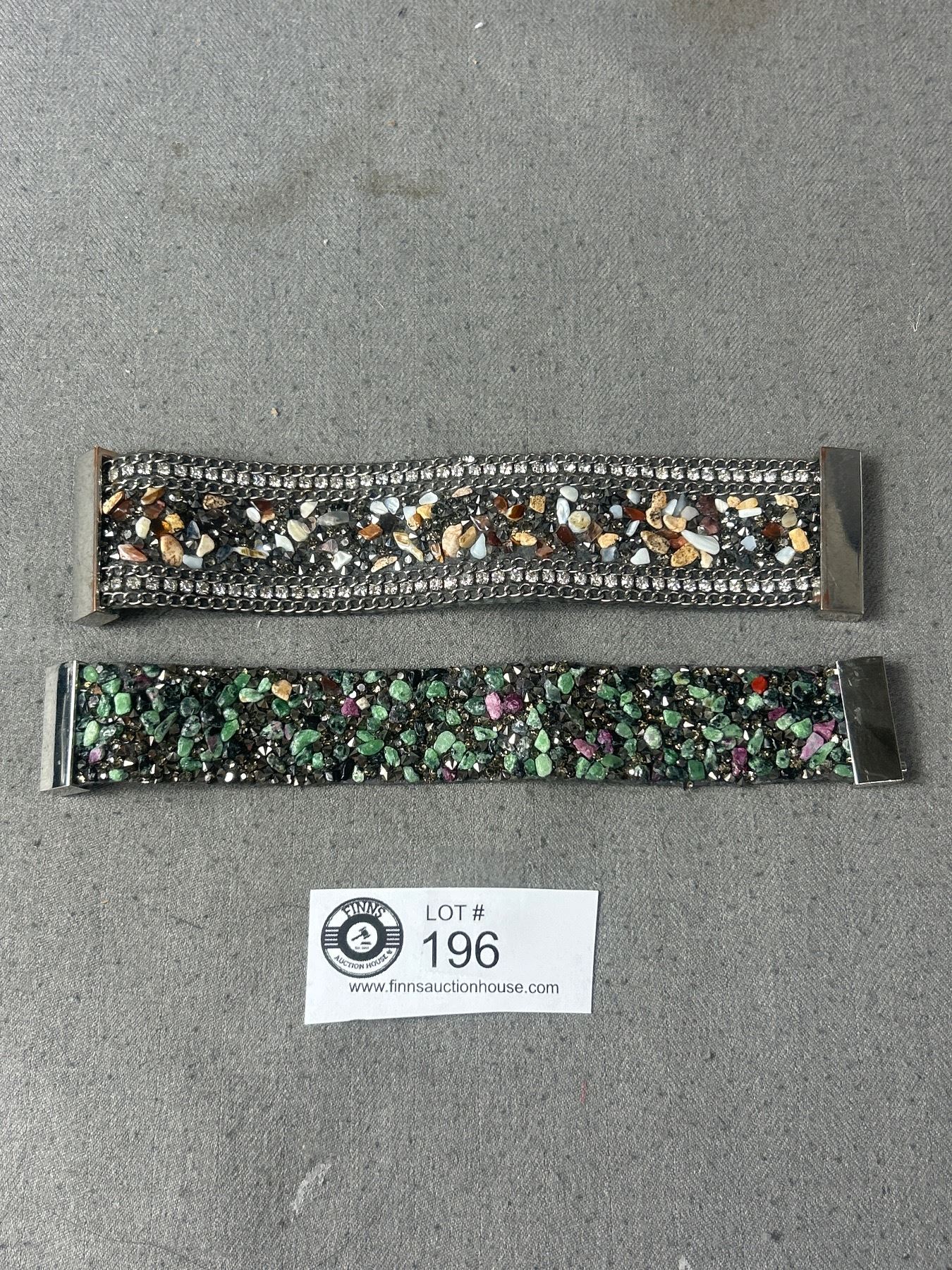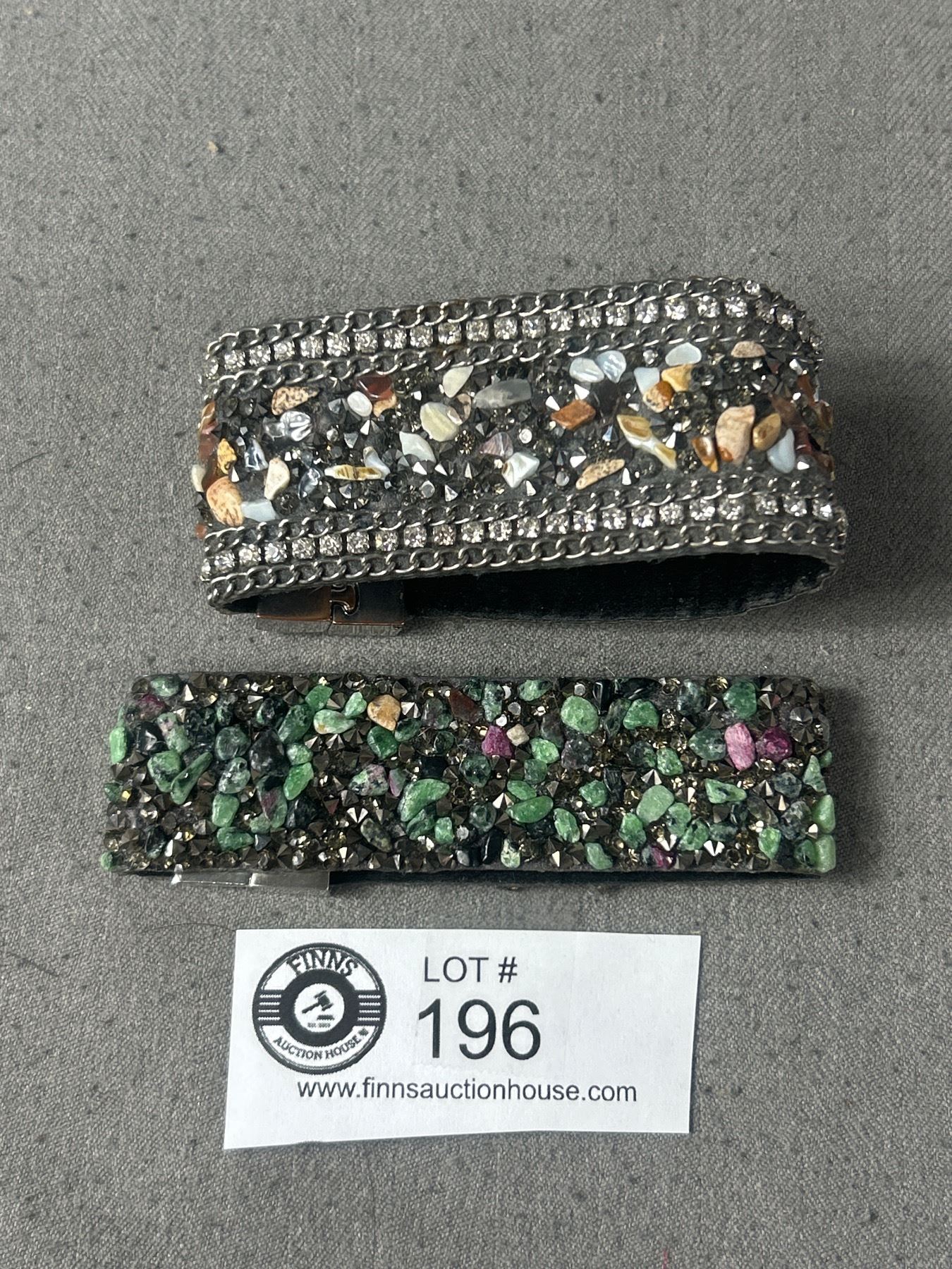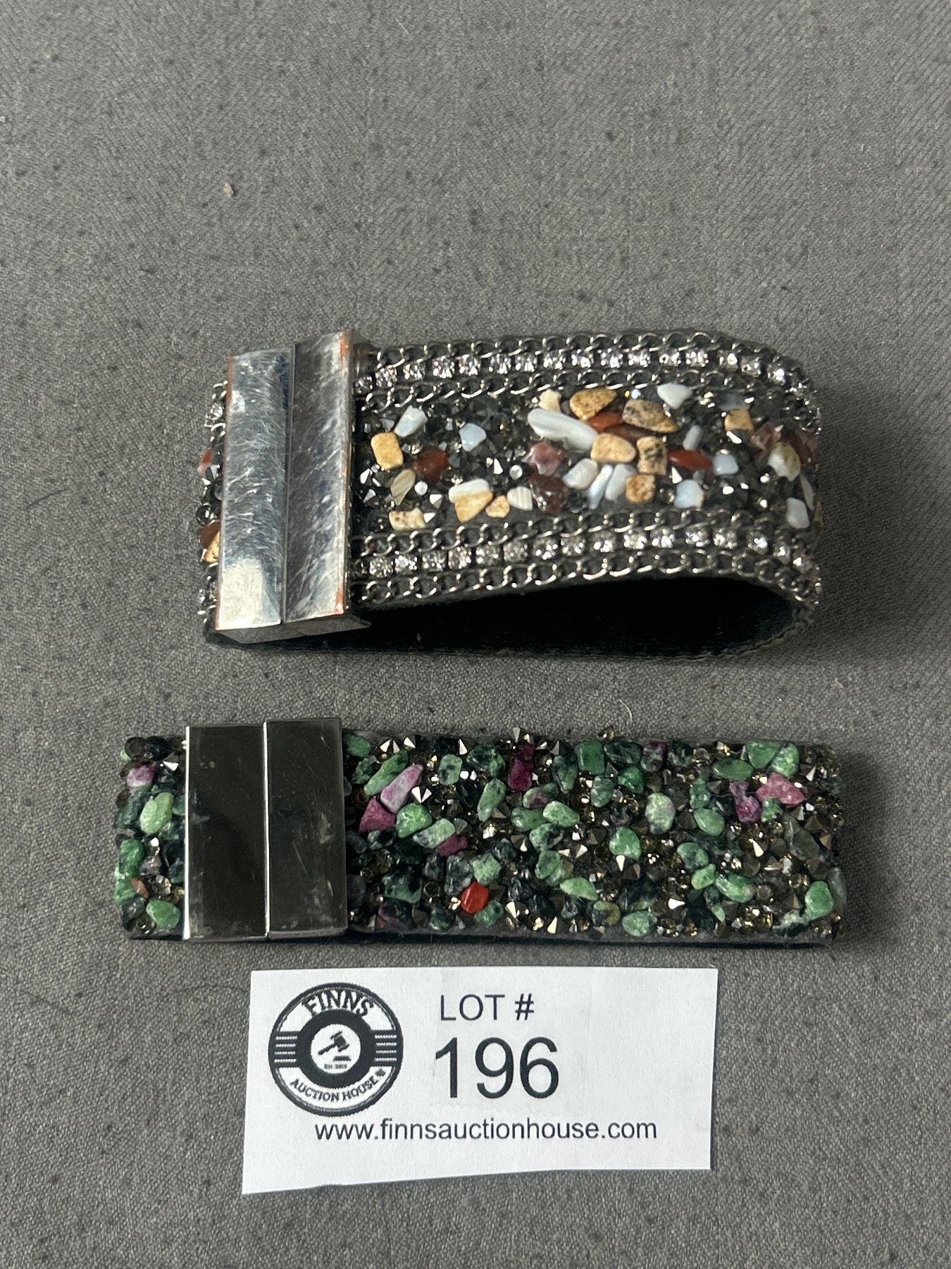 2 Gem Stones Chips On Leather Or Material Bracelets, Each Magnetic Closure
