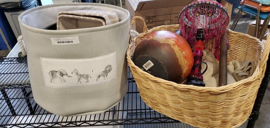 2 HAMPERS, POTTERY PLANTER, OLIVE OIL JUG, DECORATIVE TABLE LAMP