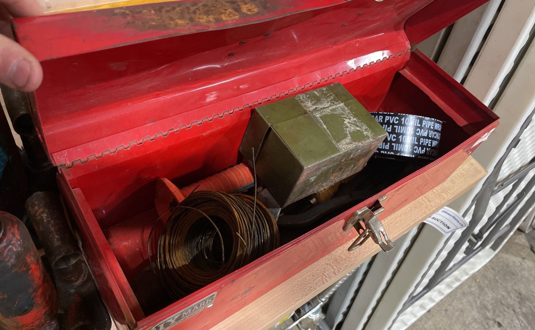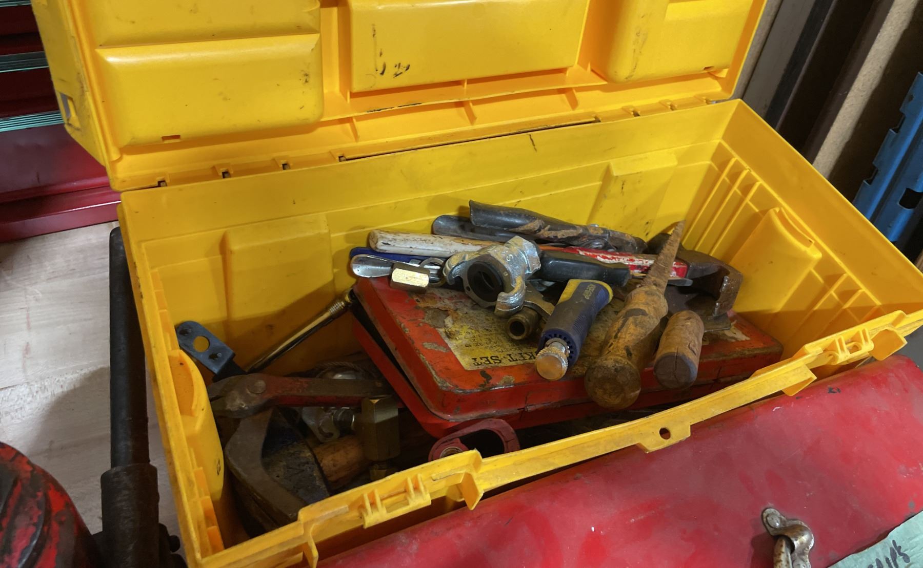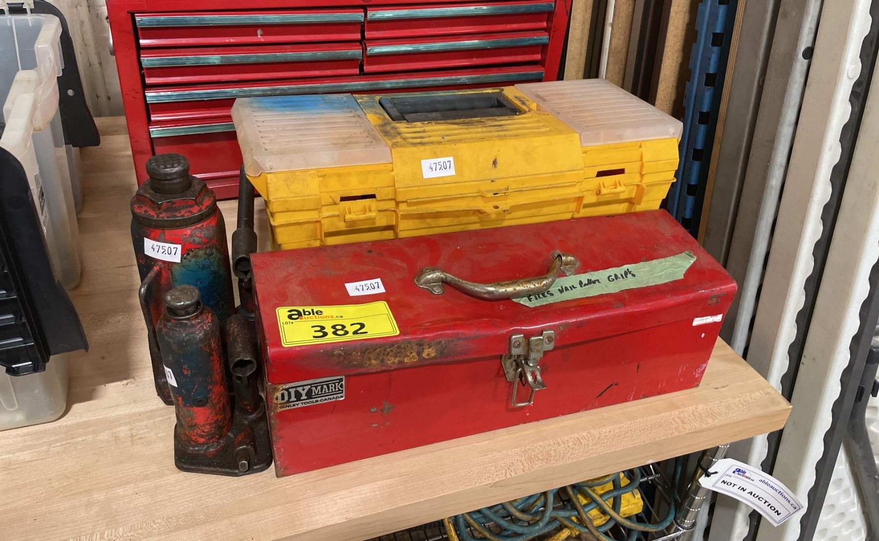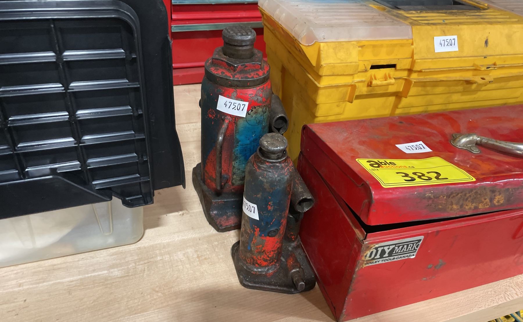 2 HYDRAULIC BOTTLE JACKS, YELLOW PLASTIC PORTABLE TOOL BOX WITH CONTENTS, & RED METAL PORTABLE TOOL BOX WITH CONTENTS *MUST TAKE ALL*