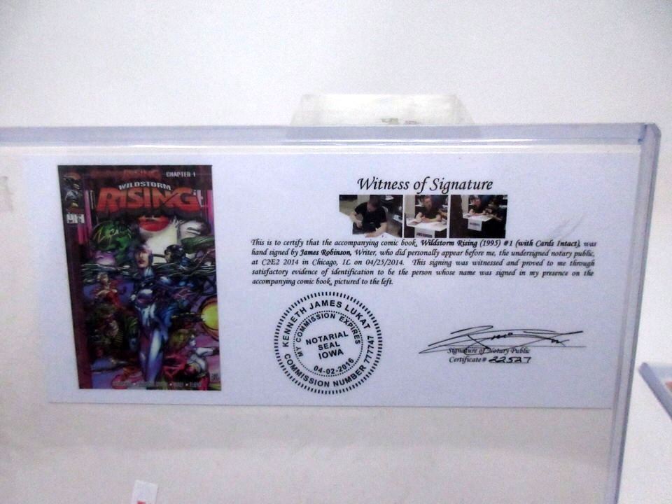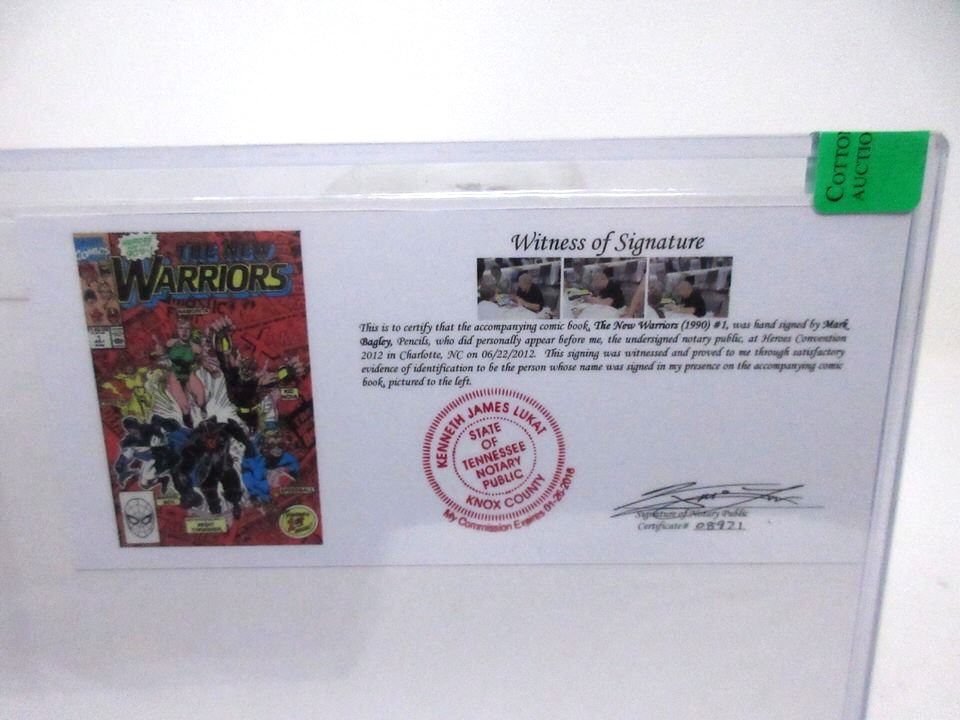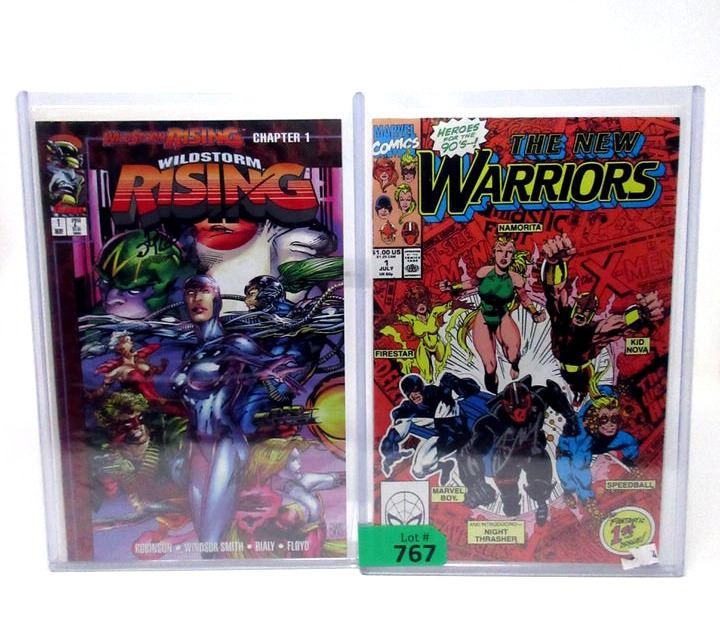 "The New Warriors #1" signed by Mark Bagley, and "Windstorm Rising #1" signed by James Robinson. Notarized signatures. In acid proof protective sleeves.