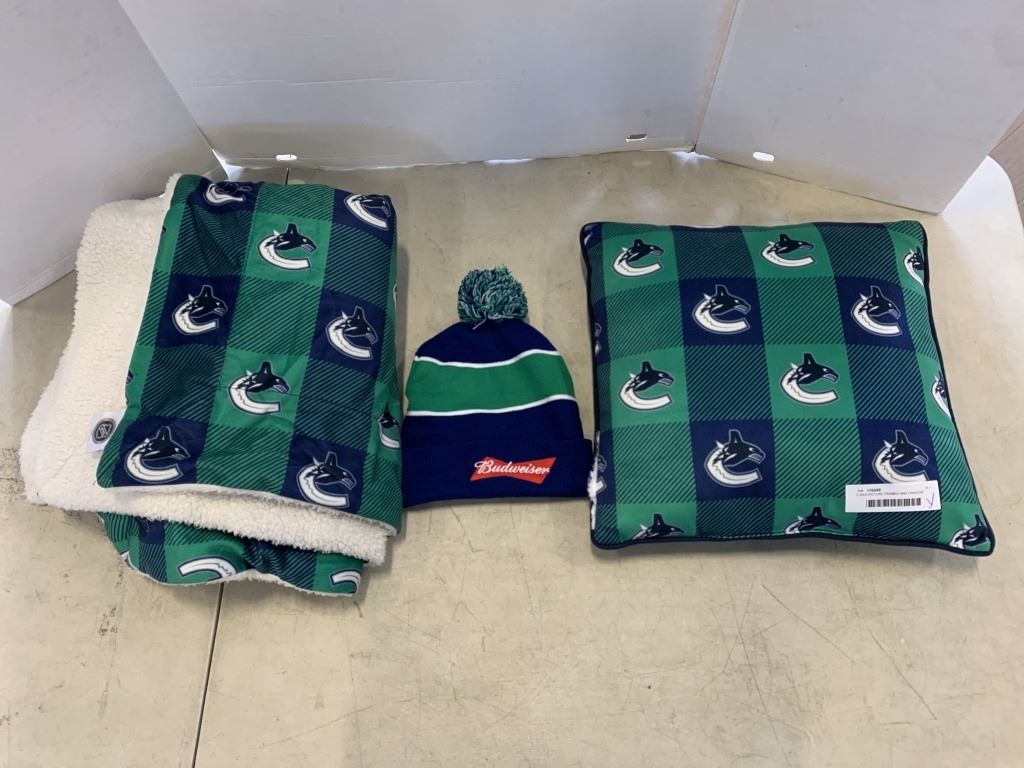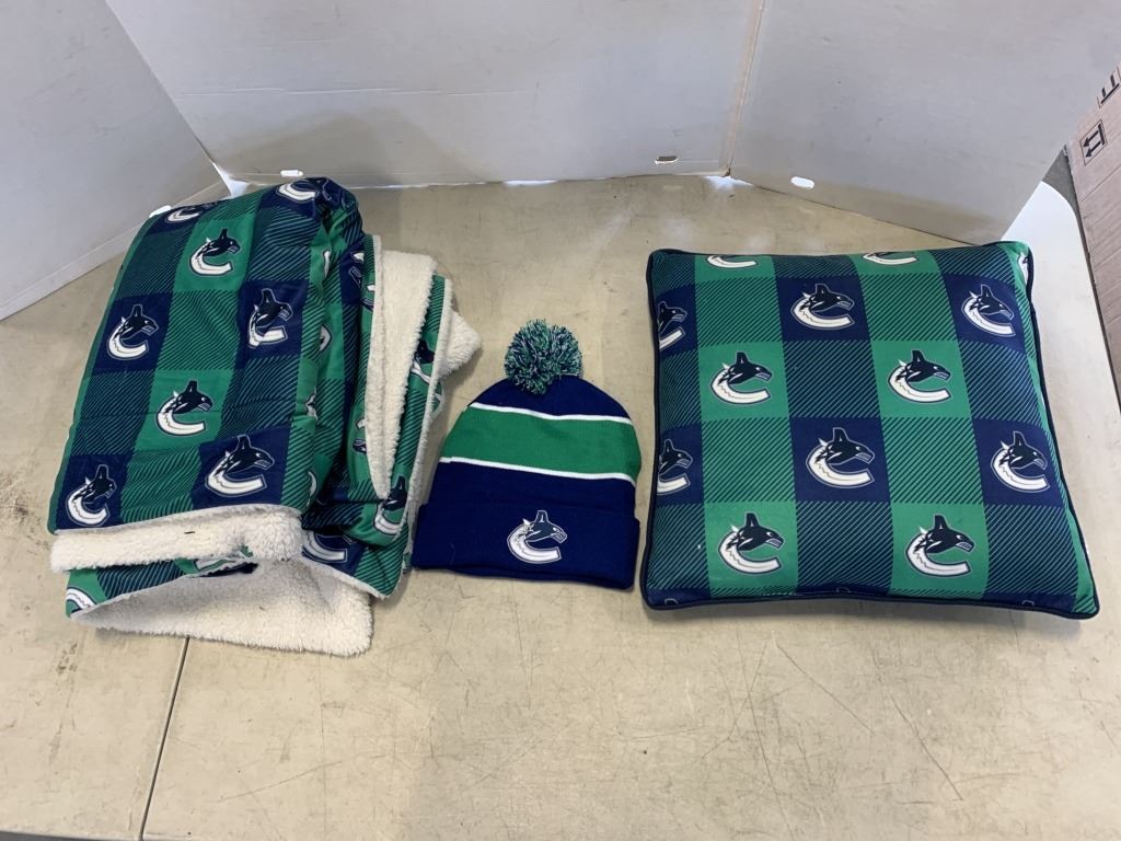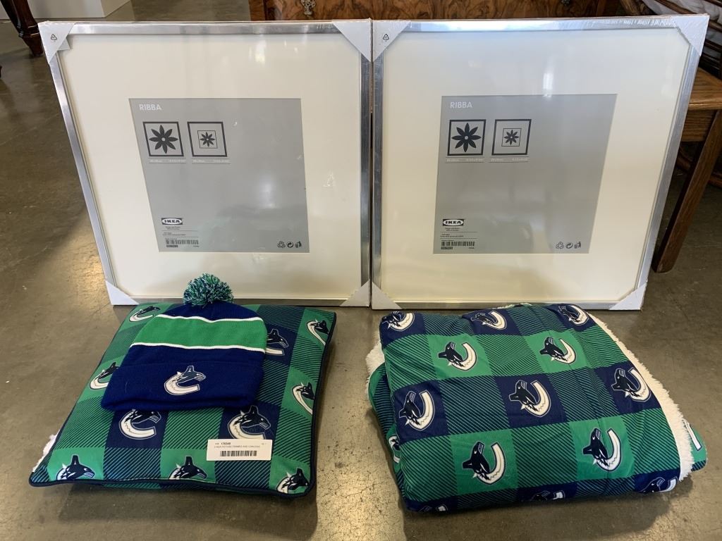 2 IKEA PICTURE FRAMES AND CANUCKS THROW BLANKET, PILLOW, AND TOQUE
