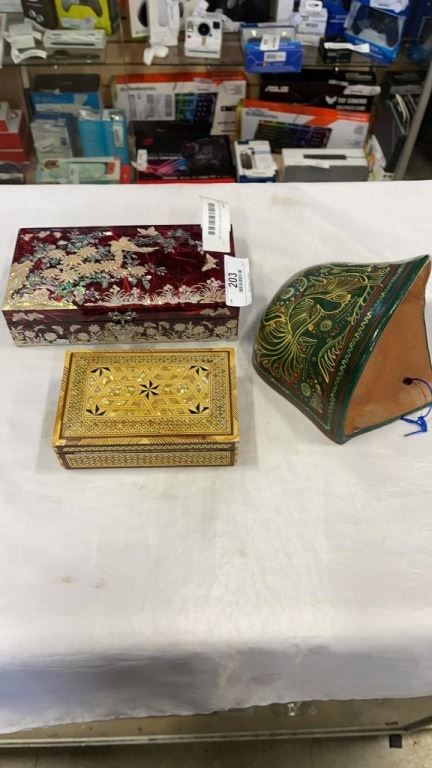 2 INLAID LAQUER JEWELRY BOXES AND POTTERY WALL POUCH