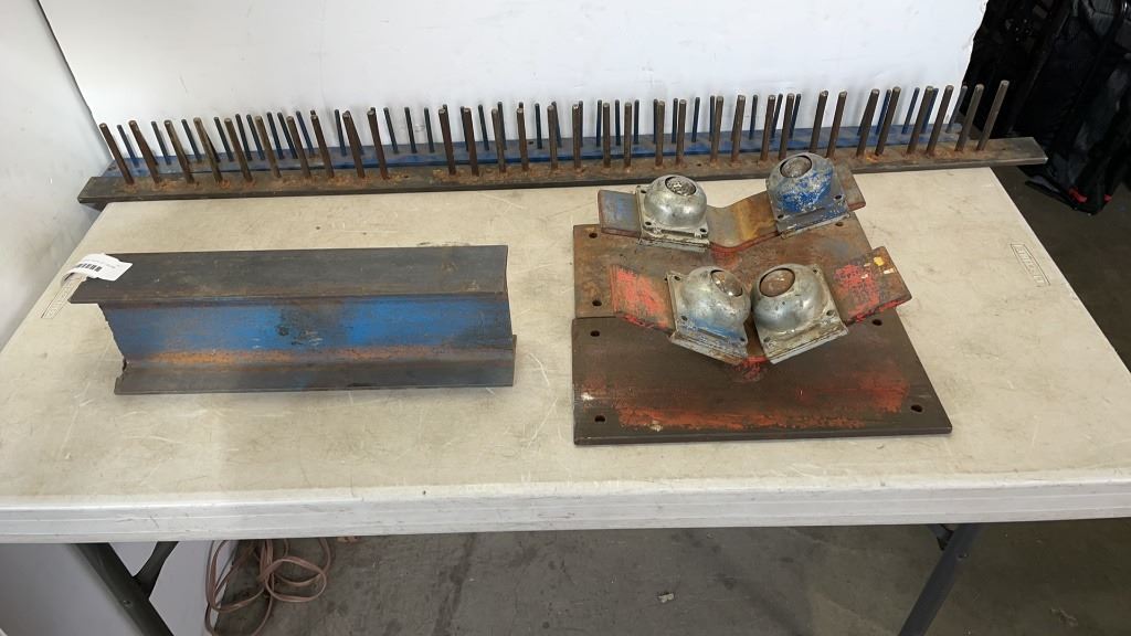 2 IRON WALL HANGERS, PIECE OF I BEAM AND 2 ADJUSTABLE ROLLERS