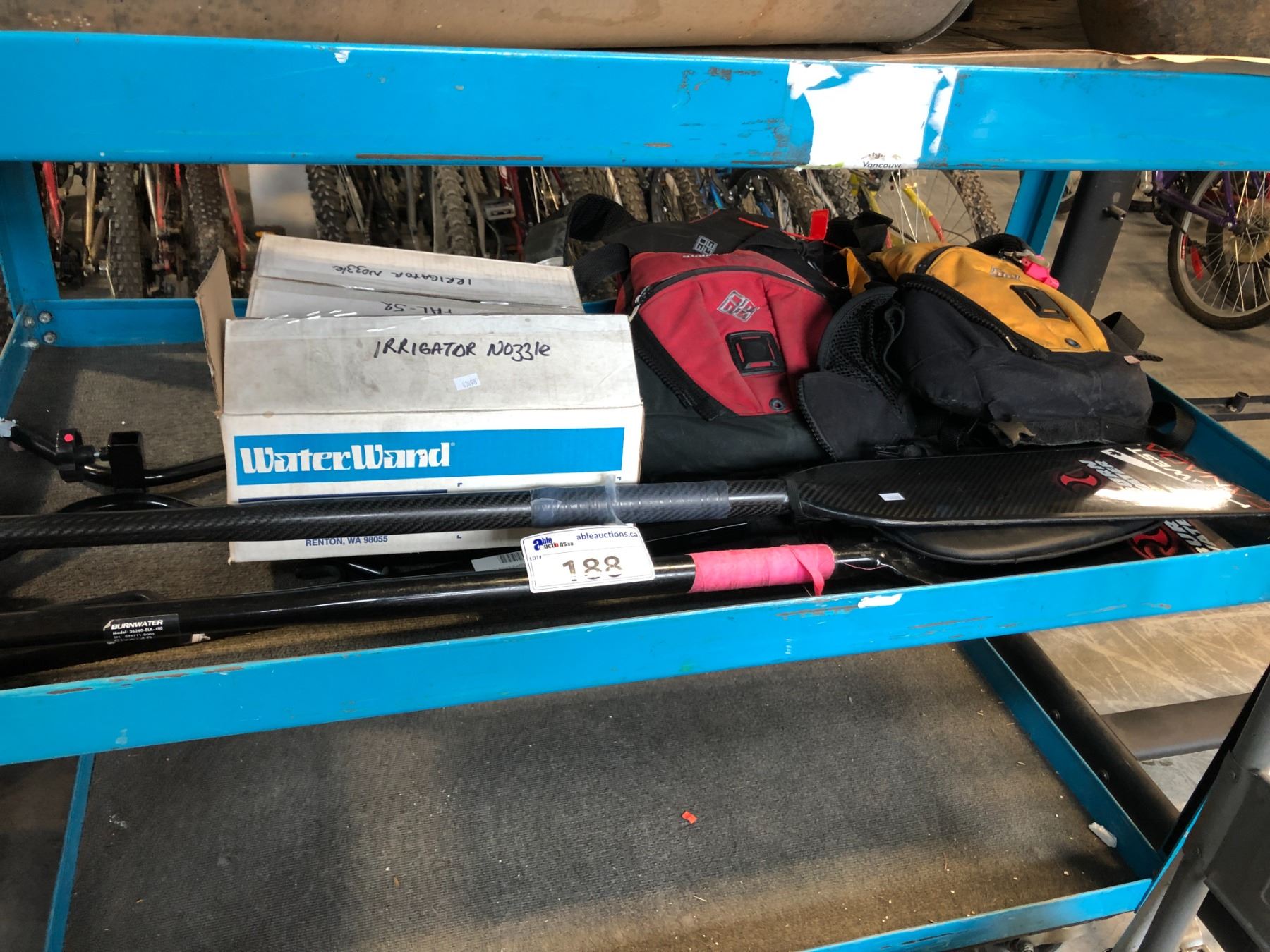 2 KAYAK LIFE JACKETS, PAIR OF CARBON FIBER PADDLES, AND 2 BOXES OF WATERWAND GENTLE FLOW IRRIGATOR NOZZLES