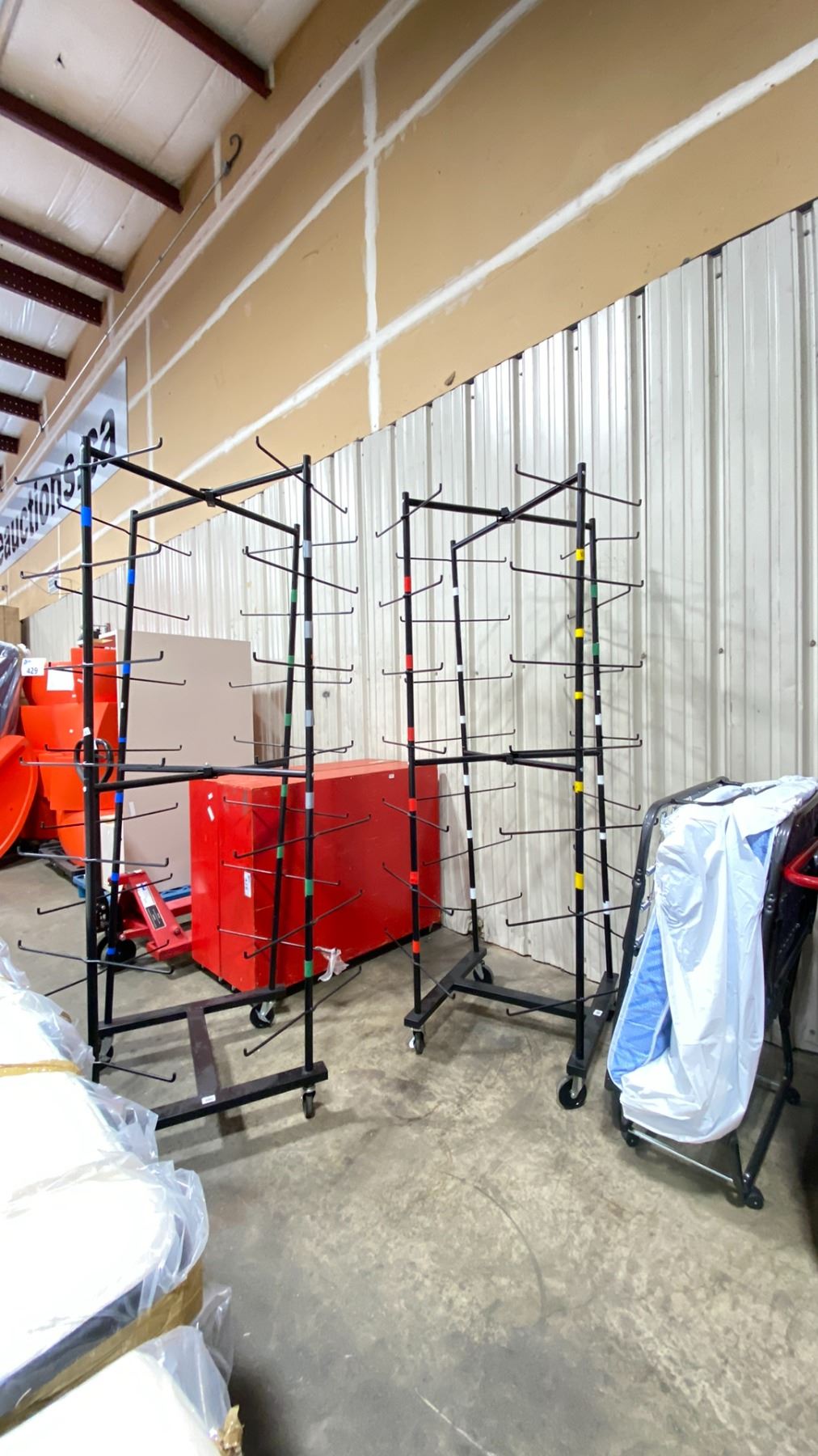 2 LARGE METAL MOBILE COMMERCIAL HELMET RACKS & METAL MOBILE FOLDING FIRST AID BED