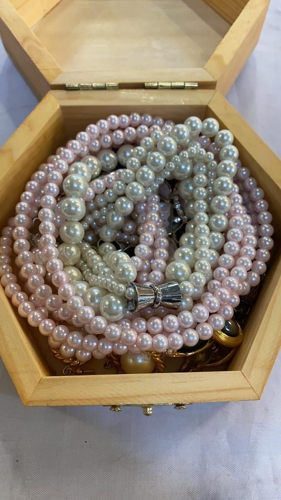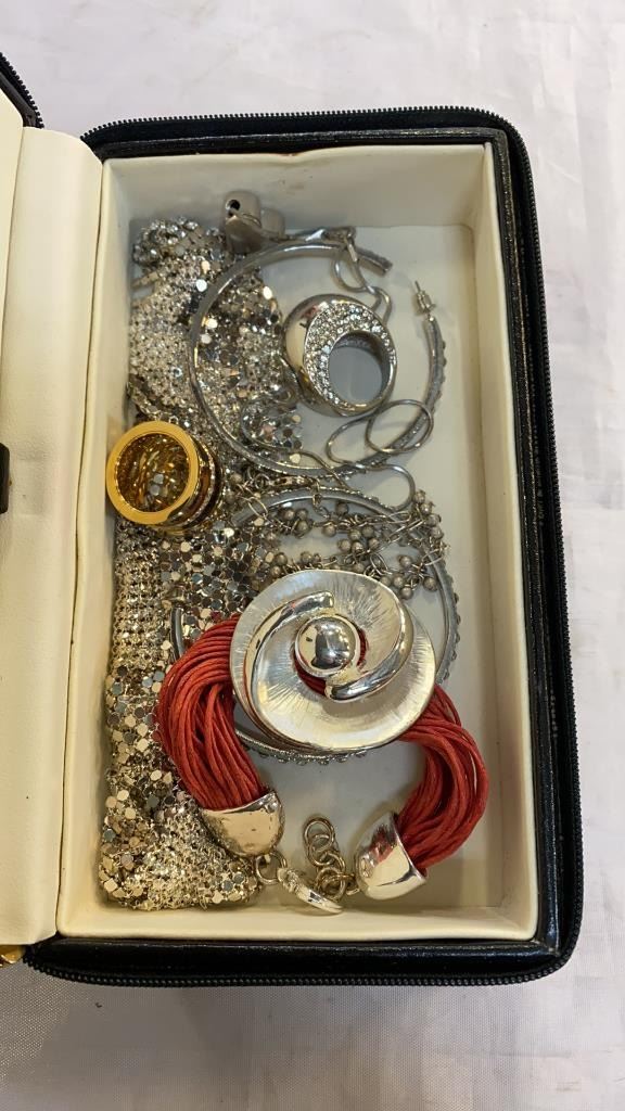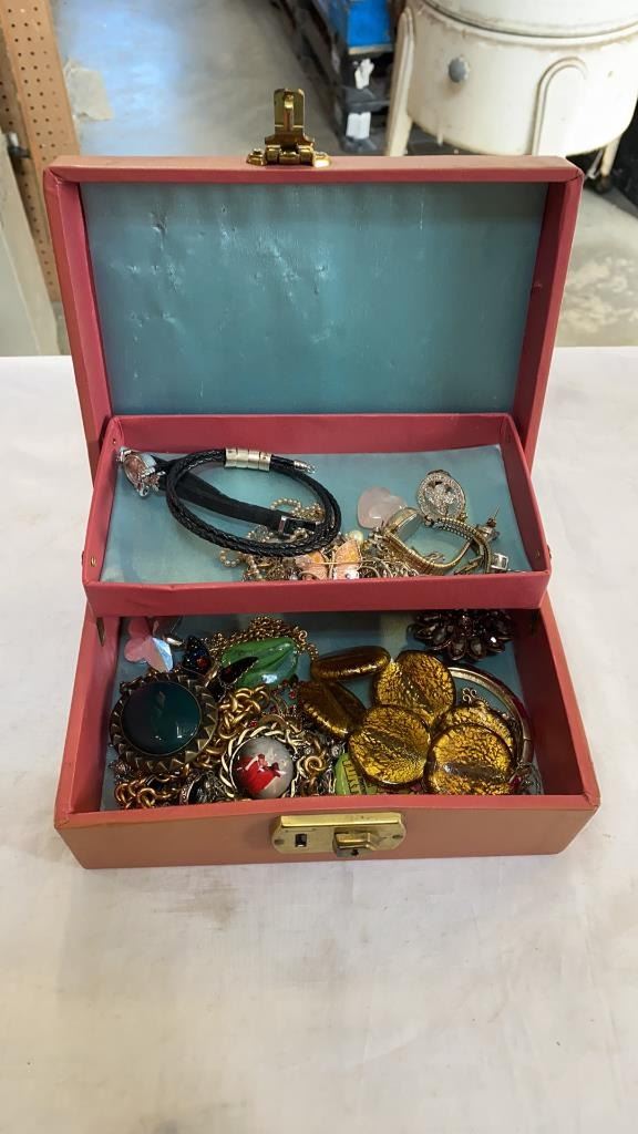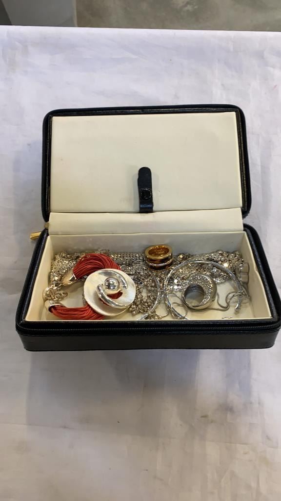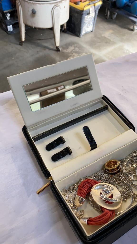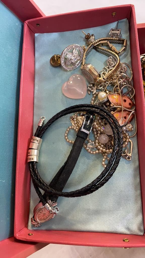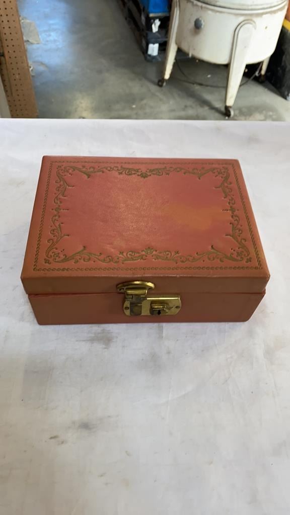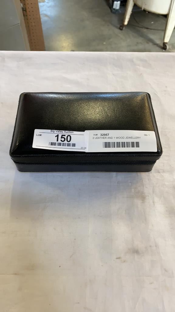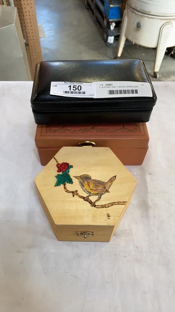 2 LEATHER AND 1 WOOD JEWELLERY BOXES W/ CONTENTS