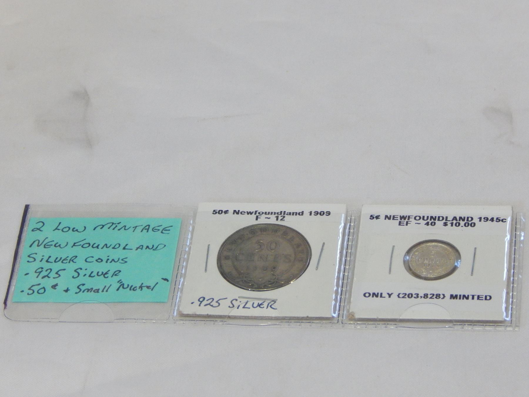 2 LOW MINTAGE NEWFOUNDLAND SILVER COINS .925 SILVER 50c AND SMALL NICKEL