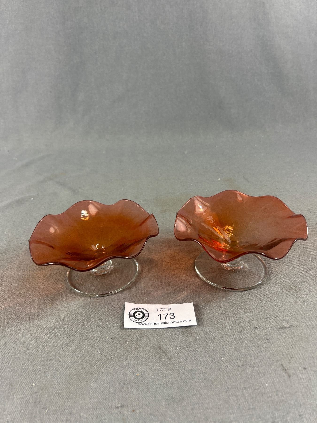 2 Late 1800's - Early 1900's Hand Blown w/ Clear Stem Pink Ruffled Trinket Dishes. Approx. 4.5" D x 2.25"H