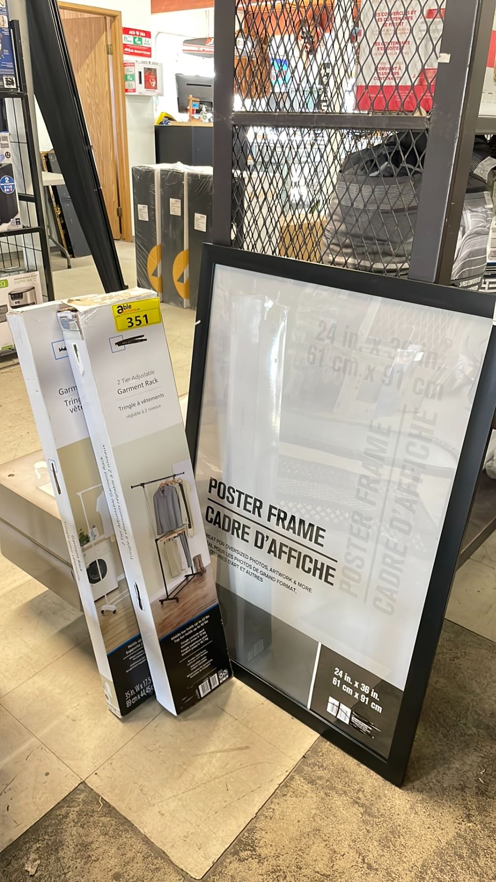 2 MAINSTAYS GARMENT RACKS & 24" X 36" POSTER FRAME