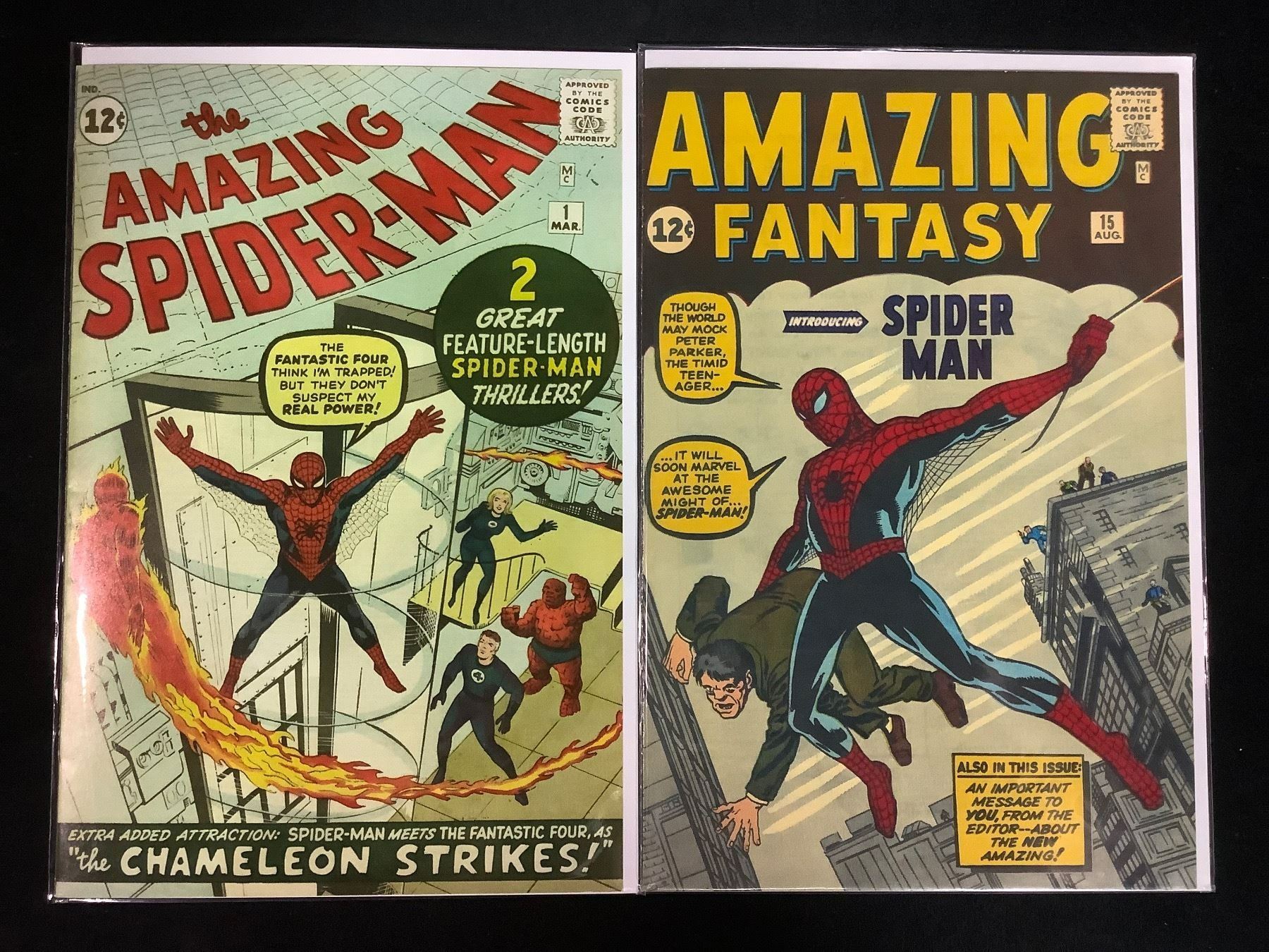 2 MARVEL SPIDER-MAN REPRODUCTION COVERS *COVERS ONLY* & FIRST APPEARANCES : THE AMAZING SPIDER-MAN #1 FIRST APPEARANCES OF: JOHN JAMESON, J. JONAH JAMESON, & CHAMELEON, THE AMAZING FANTASY #15 FIRST APPEARANCES OF: UNCLE BEN, SPIDER-MAN, FLASH THOMPSON, THE BURGLAR, & AUNT MAY