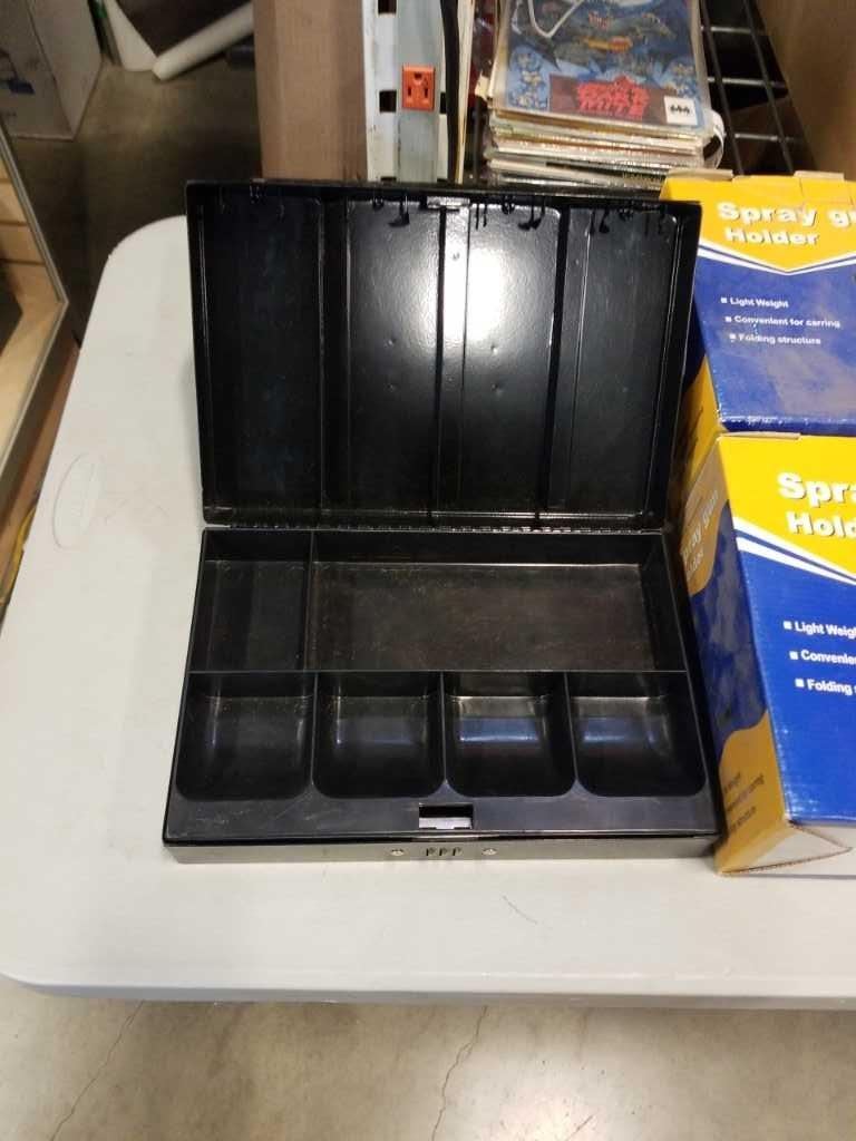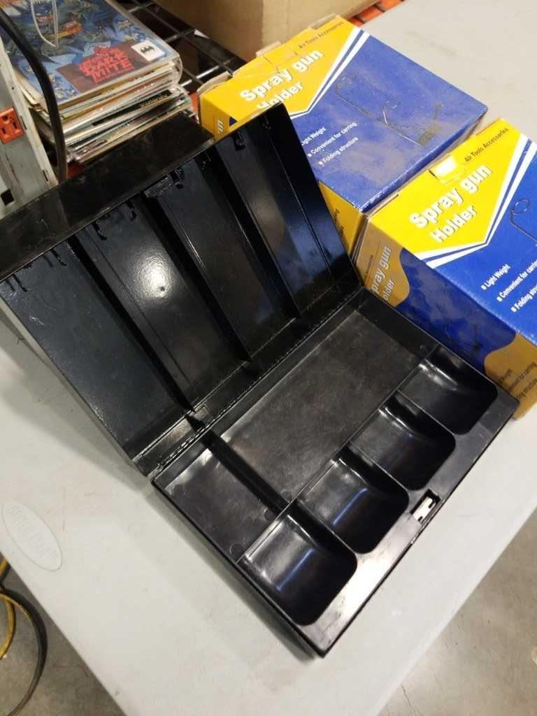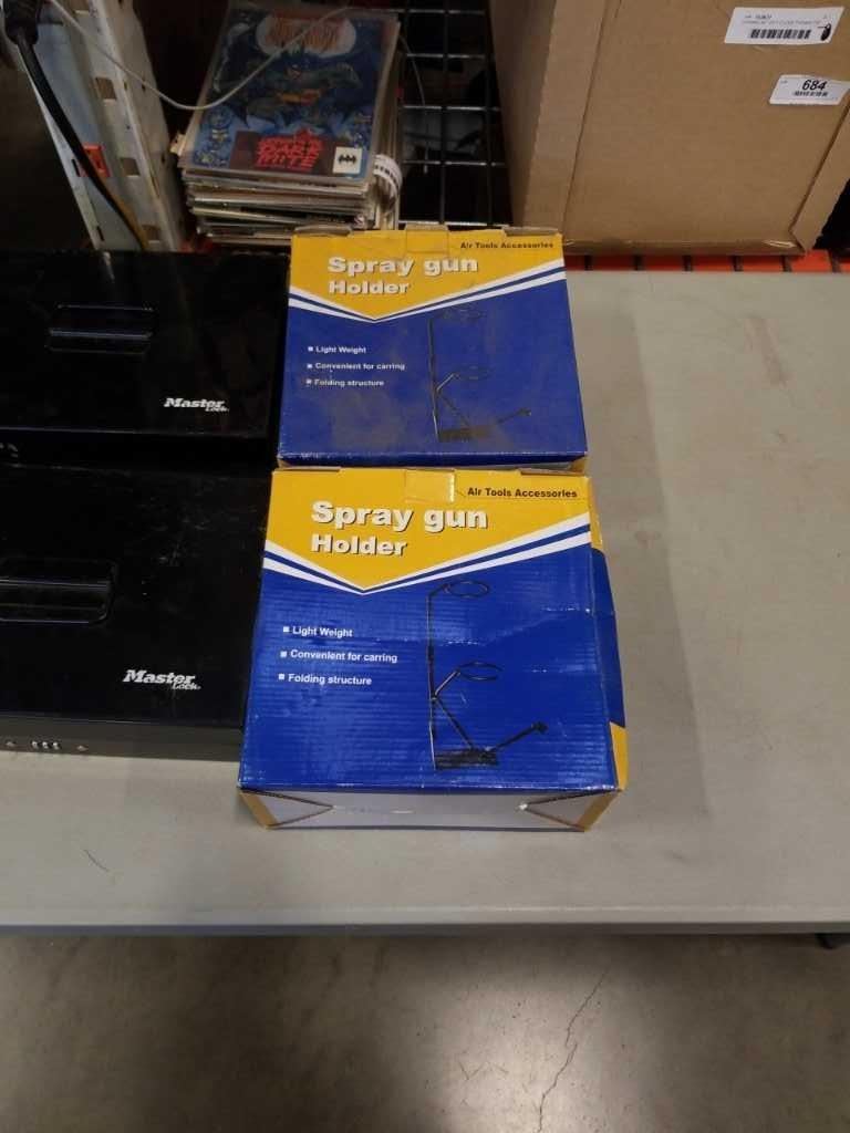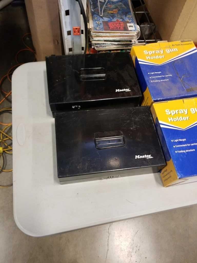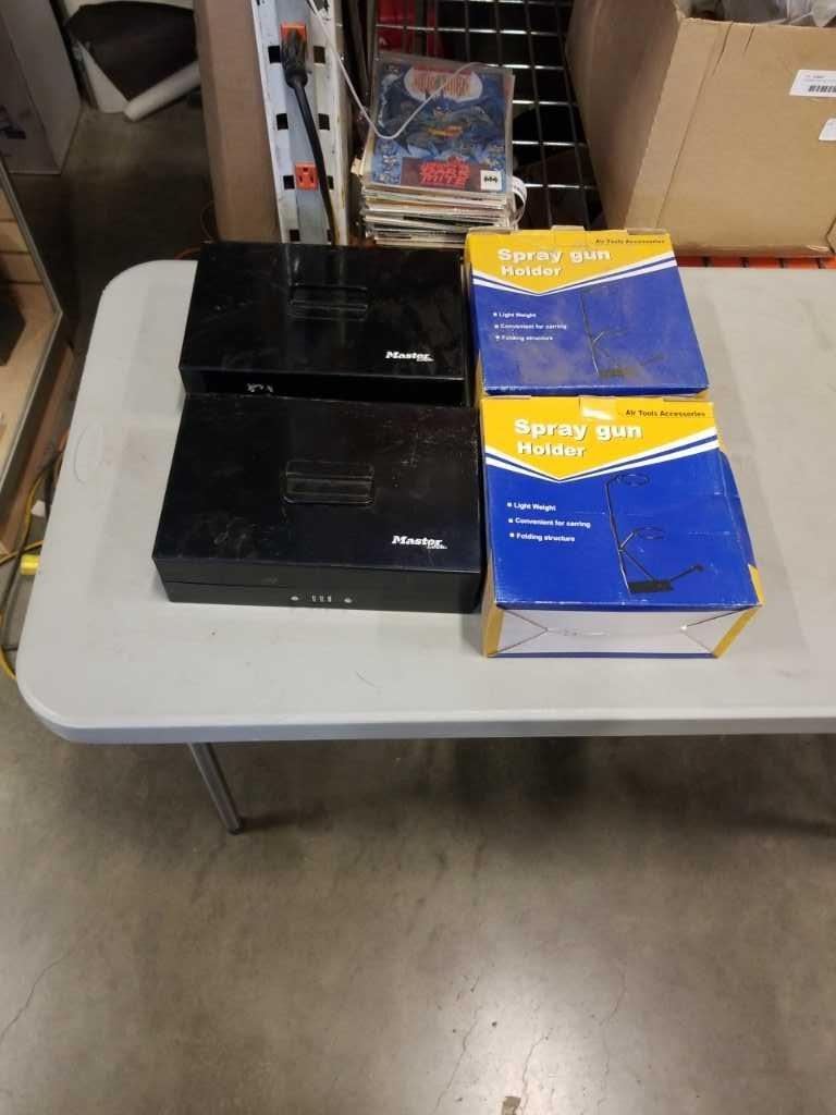 2 MASTERLOCK COMBINATION CASH BOXES AND 2 NEW SPRAY GUN HOLDERS