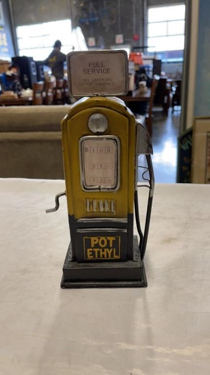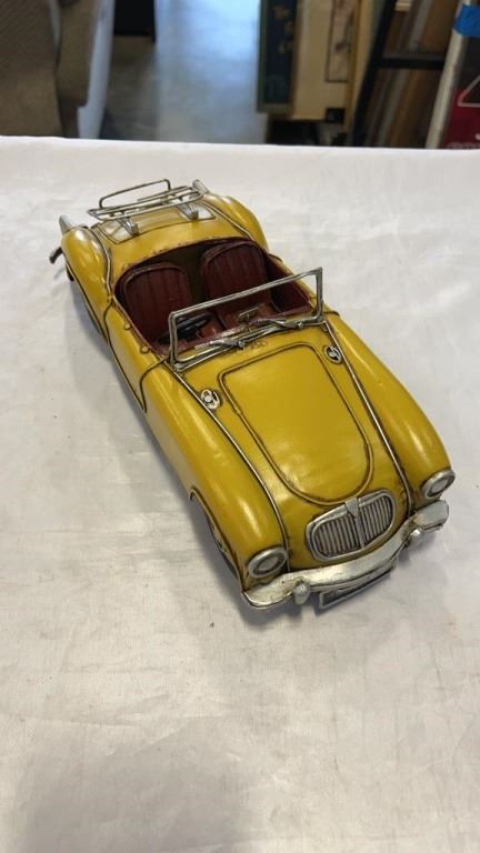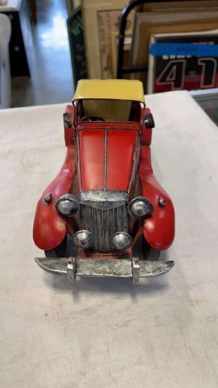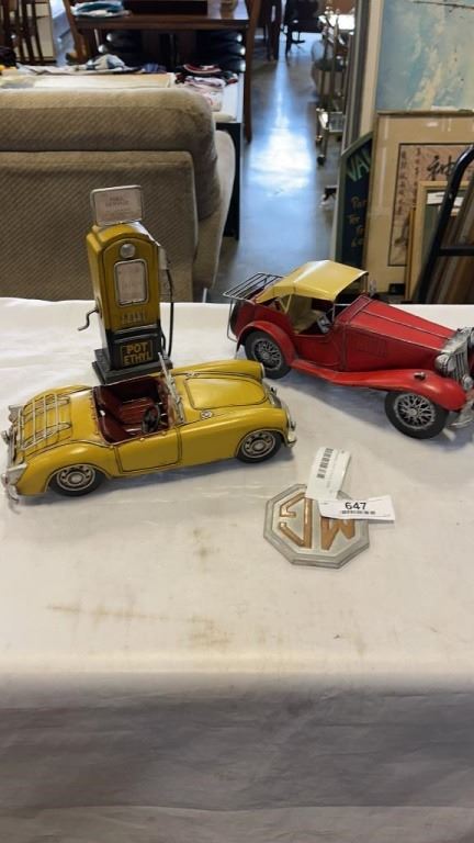 2 METAL CAR FIGURES, POT ETHYL GAS CAN FIGURE AND MG SIGN
