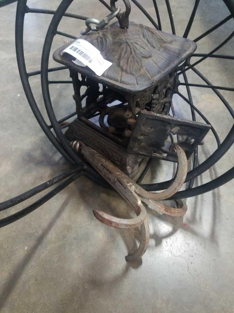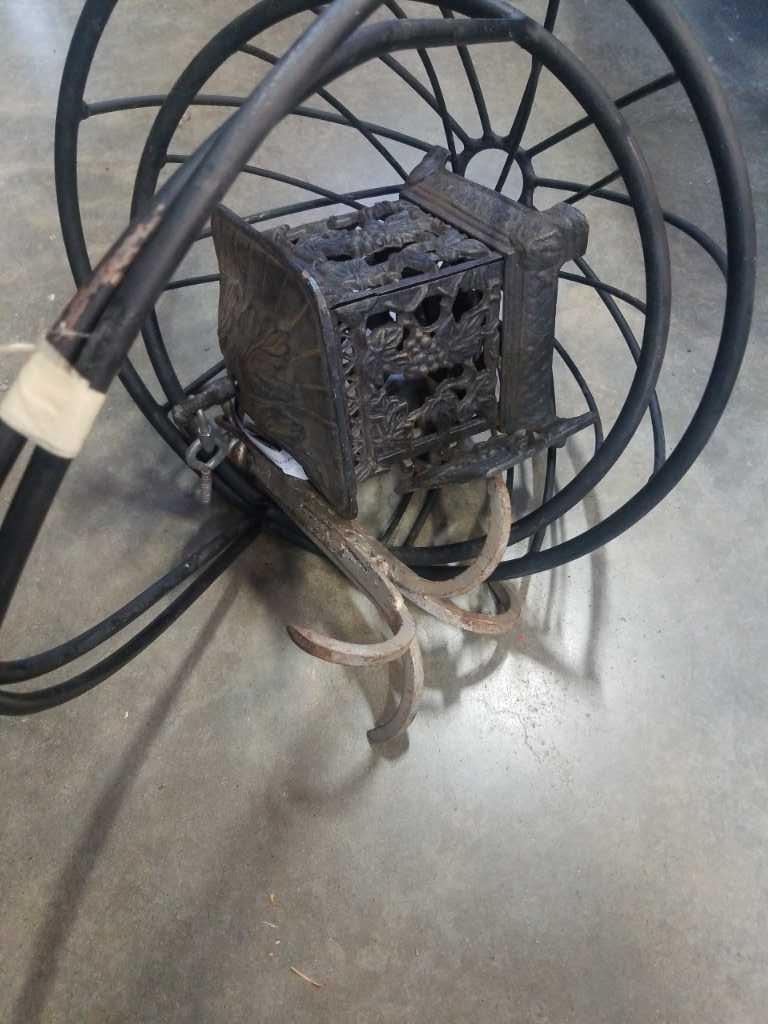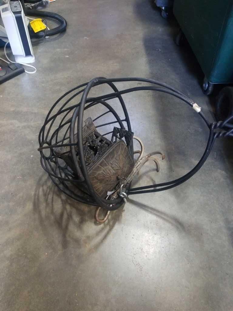 2 METAL HANGING PLANTER BASKETS AND IRON CANDLE LANTERN