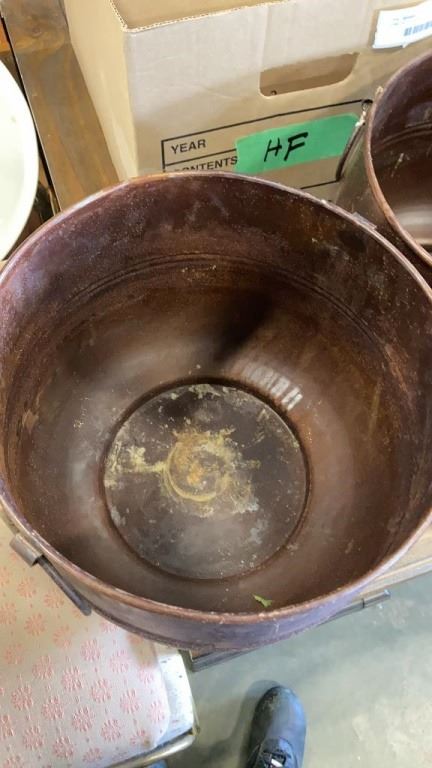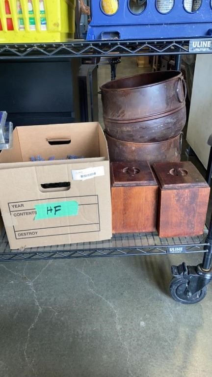 2 METAL PLANTER POTS, 2 WOOD CANNISTERS AND ARTIFICIAL PLANTS