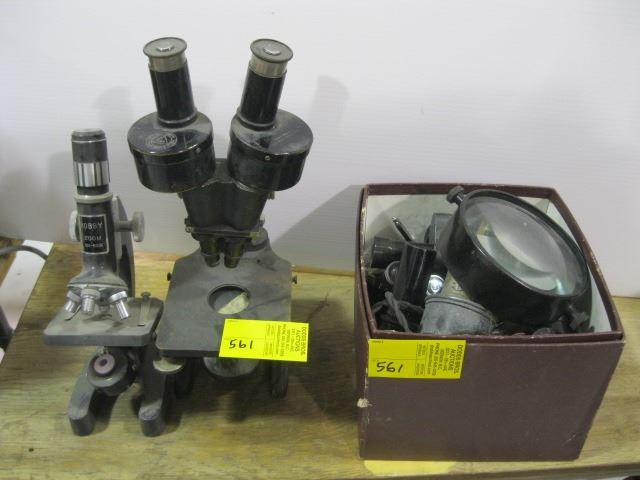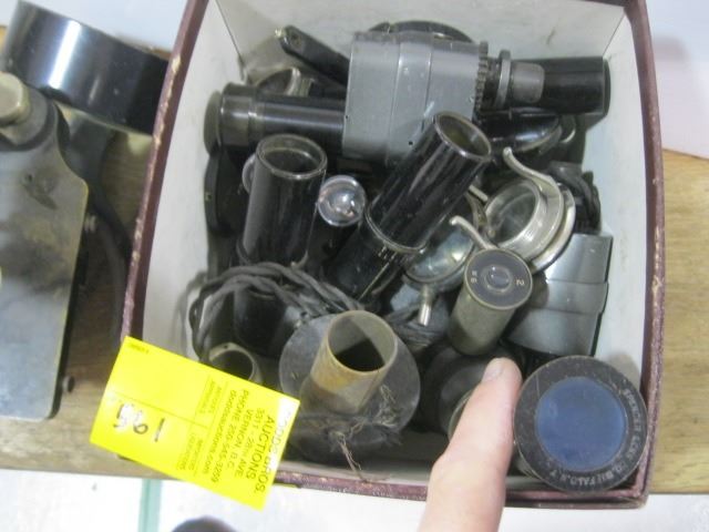 2 MICROSCOPES, A BAUSCH & LOMB AND A HOBBY & A BOX OF ASST. MICROSCOPE PARTS, ETC.