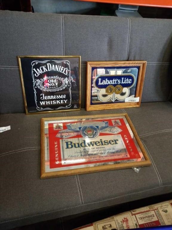 2 MIRRORED BEER SIGNS AND FRAMED JACK DANIELS
