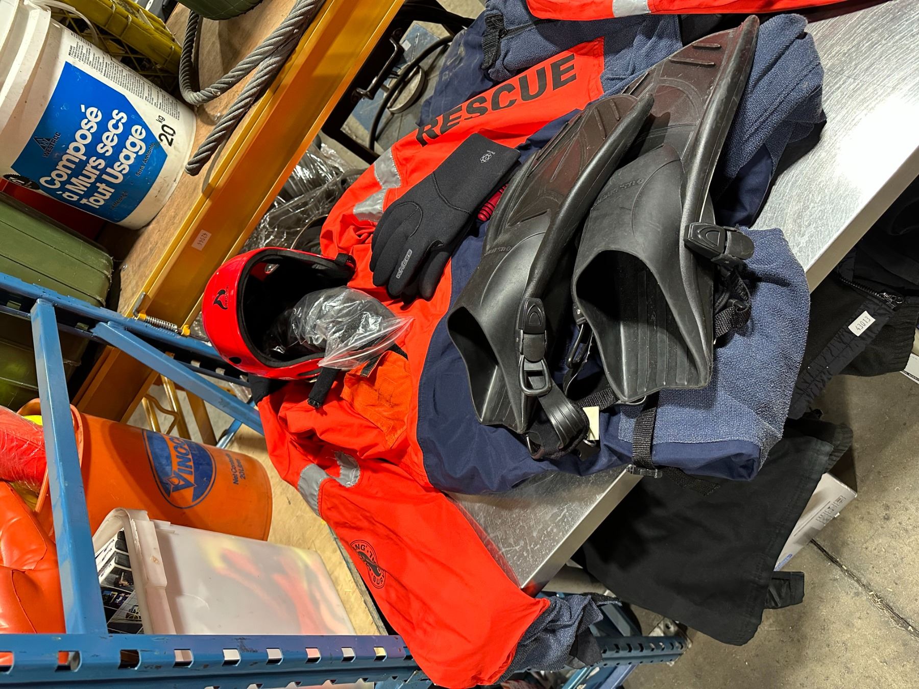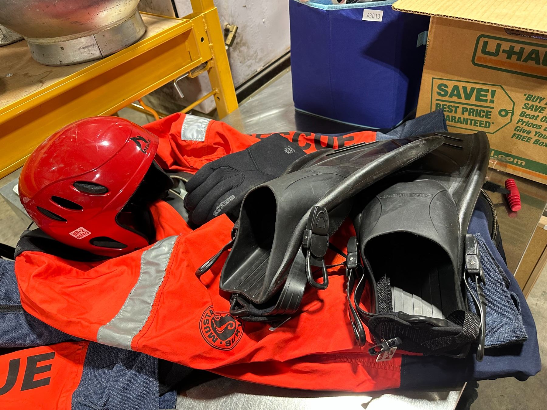 2 MUSTANG SURVIVAL DRY RESCUE SUIT WITH 2 PAIRS OF BLACK NEOPRENE GLOVES, 2 PAIRS OF US DIVERS FLIPPERS, & 2 RED PREDATOR RESCUE HELMETS