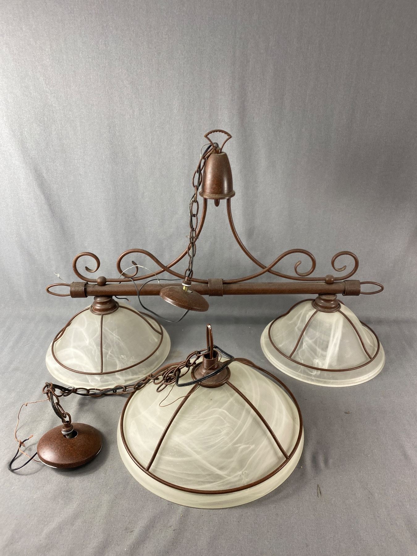 2 Matching Metal Ceiling Light Fixtures w/ Glass Shades - 2 Light Island Approx. 34"L w/13" D Shades & 15" Diam Chain Pendant Light