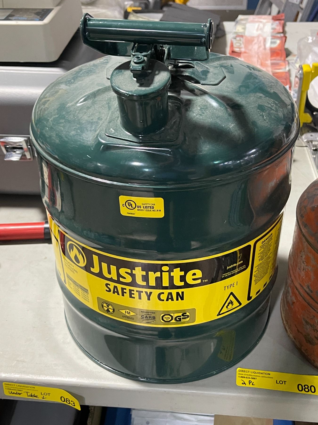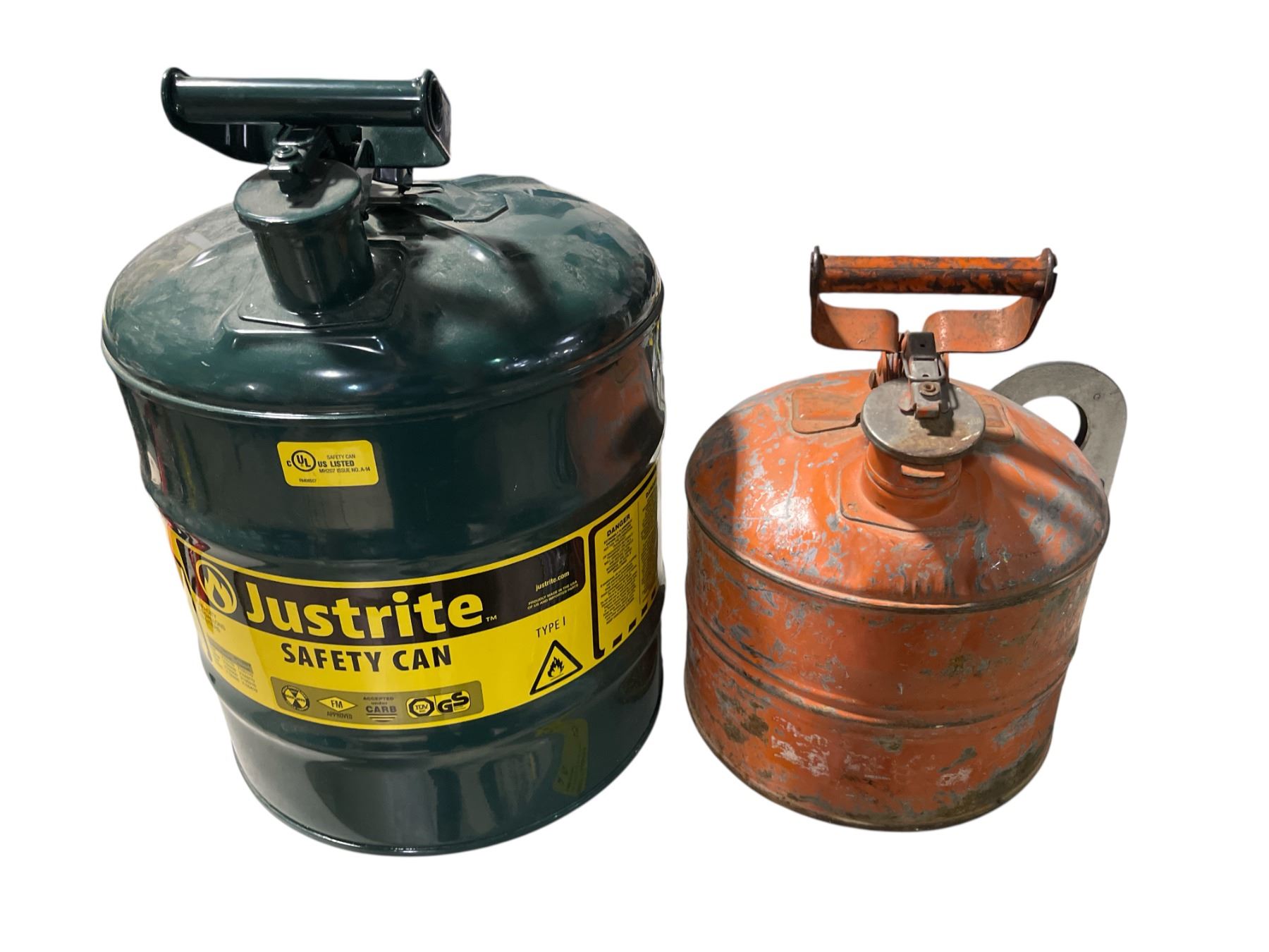 (2) Metal Safety Fuel Cans - Justrite Green & Vintage Red