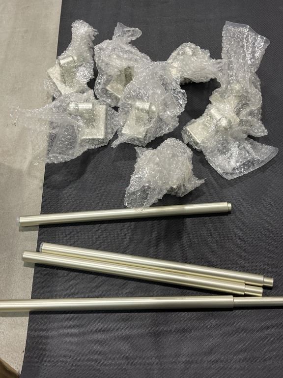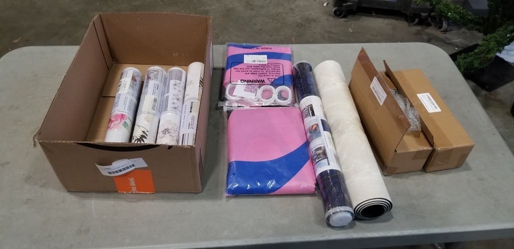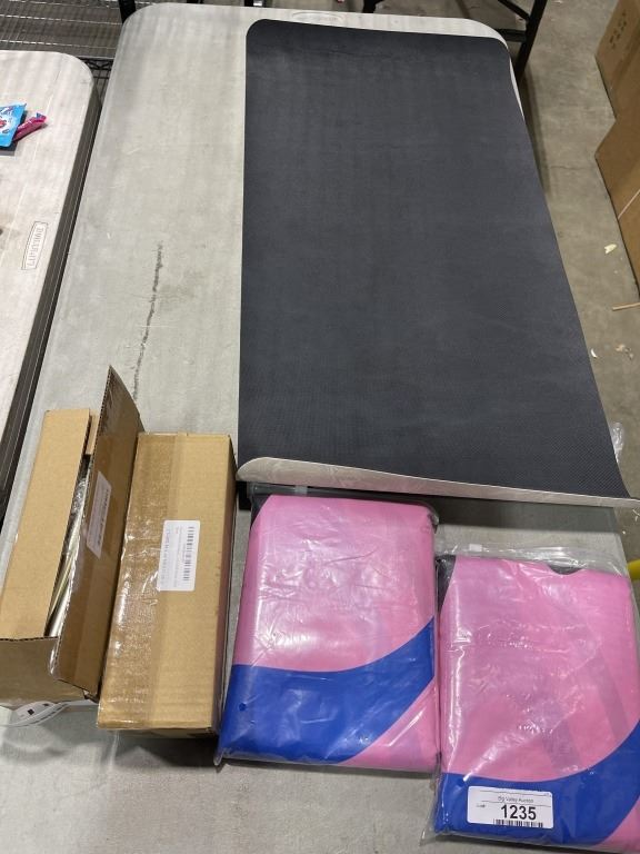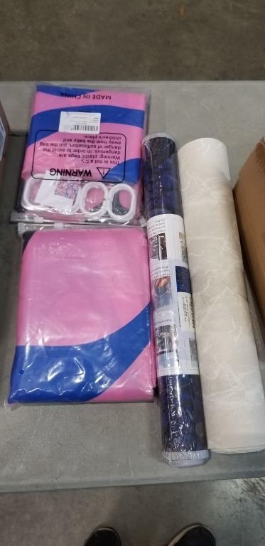 2 NEW 70'S RETRO PINK AND BLUE SHOWER CURTAINS AND 1 NEW SUPER WATER ABSORBENT BATH MATTS, LIGHT GREY 16X31.5 INCH , AND 2 NEW MAGNETIC TELESCOPING RODS