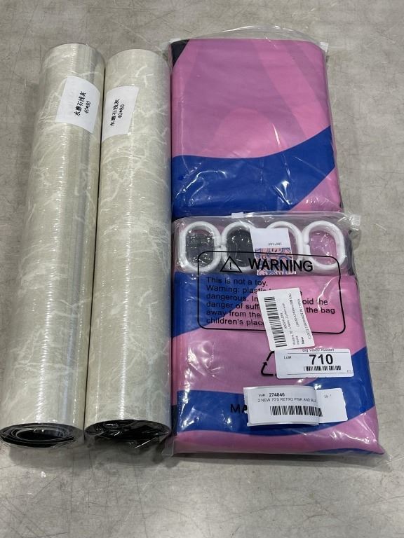 2 NEW 70'S RETRO PINK AND BLUE SHOWER CURTAINS AND 2 NEW SUPER WATER ABSORBENT BATH MATTS, LIGHT GREY 16X31.5 INCH