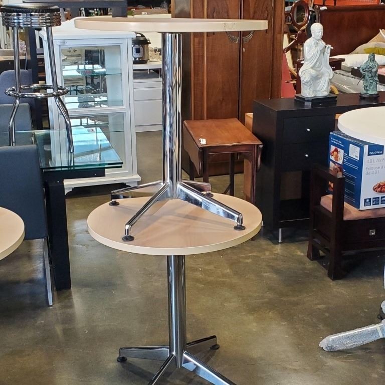 2 NEW CHROME BASE MAPLE PUB / CAFE TABLES ,30" HIGH 28" DIAMETER