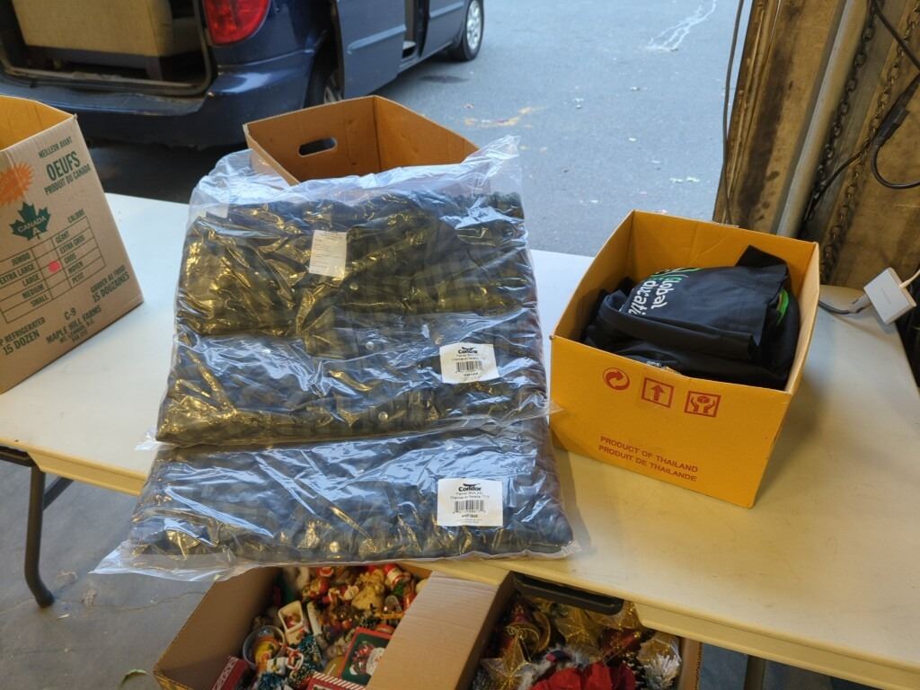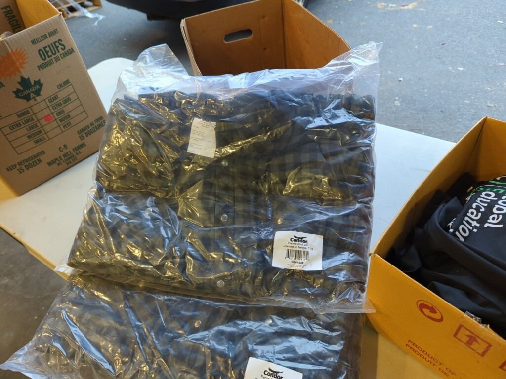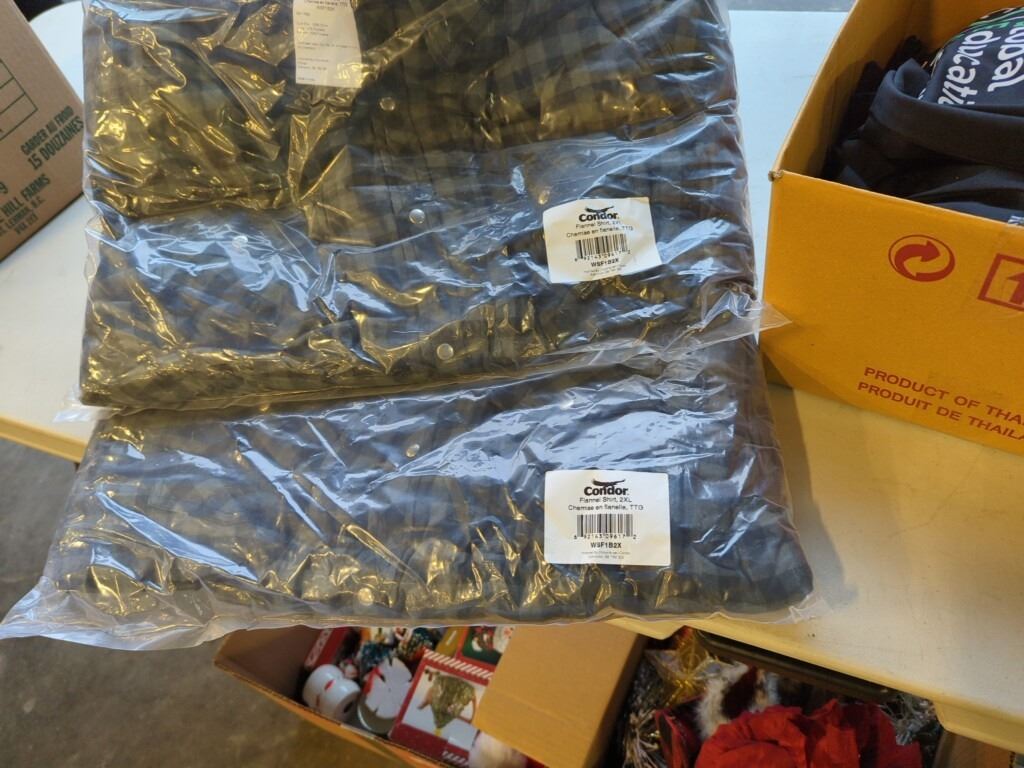 2 NEW CONDOR 2XL FLANNEL SHIRTS AND BOX OF NEW FABRIC BAGS
