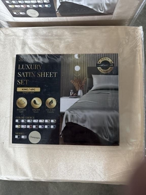 2 NEW KINGSIZE 4PC LUXURY SATIN SHEET SETS, CHAMPAGNE AND TAUPE