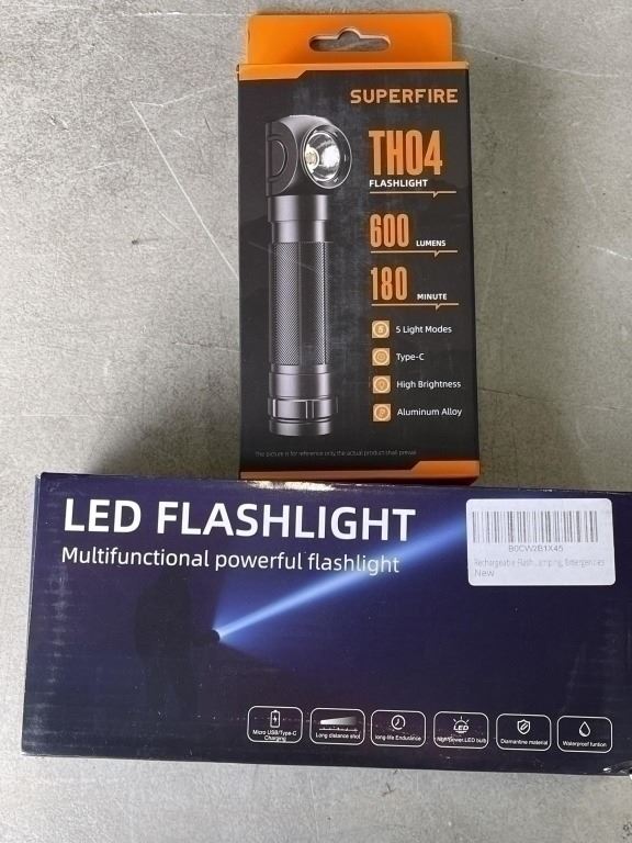 2 NEW LED FLASHLIGHTS - 1 SUPERFIRE TH04 600 LUMEN LED FLASHLIGHT, WITH 5 LIGHT MODES, TYPE C CHARGE RECHAERGABLE BATTERY, 180 MINUTE LIFE, TAIL MAGNET AND 1 LED FLASHLIGHT RECHARGEABLE WITH WORKLIGHT 6 IN 1 LIGHT MODES, INCLUDES BATTERY AND CHARGE, AND TAIL MAGNET RETAIL $40 EACH