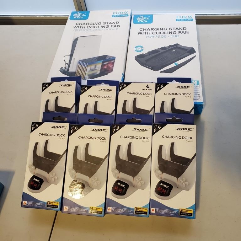 2 NEW PS5 COOLLING STANDS WITH 8 NEW DUAL CONTROLLER CHARGERS