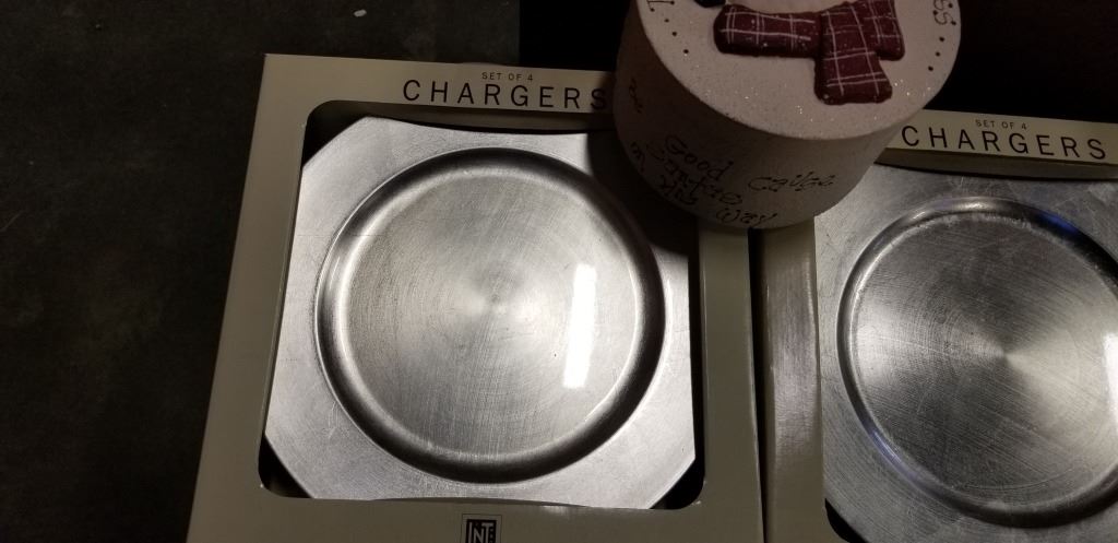 2 NEW SETS OF CHRISTMAS CHARGER PLATES, AND NEW HAND MADE GIFT BOX