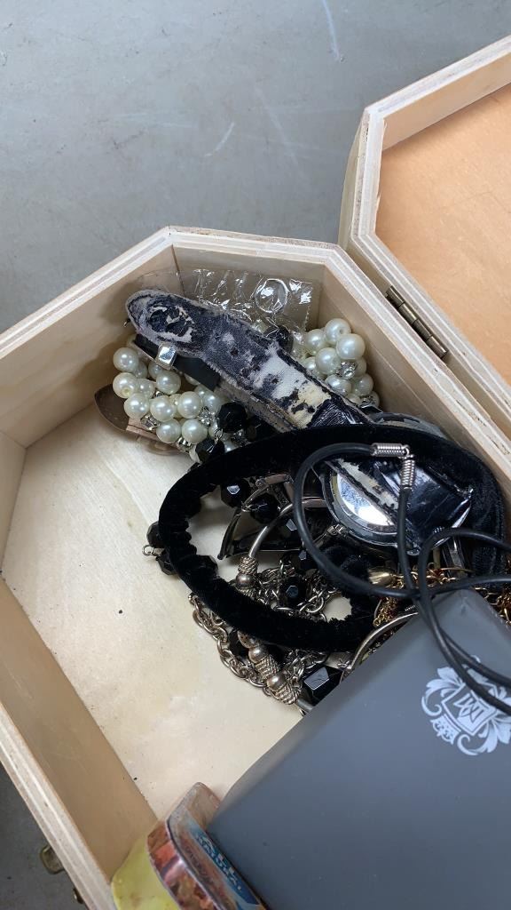 2 NEW TELESCOPING TIE AND BELT ORGANIZERS WITH BOX OF JEWELRY
