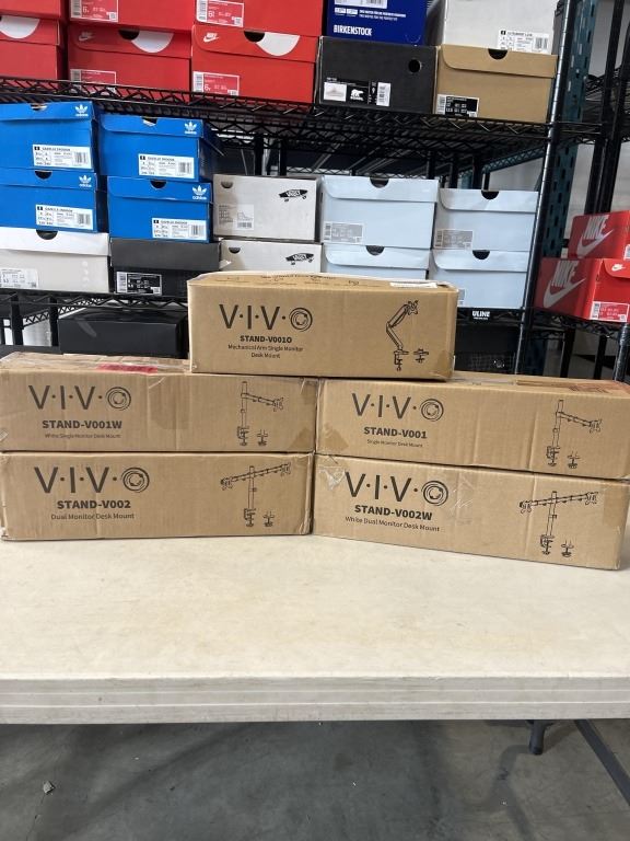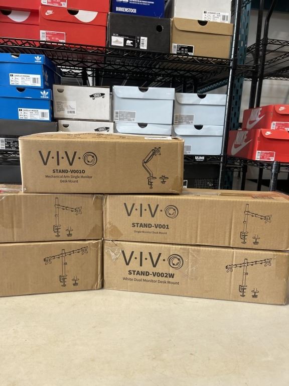 2 NEW VIVO DUAL MONITOR DESK MOUNTS, 2 SINGLE MONITOR DESK MOUNTS AND SINGLE MOINTOR MECHANICAL ARM MOUNT