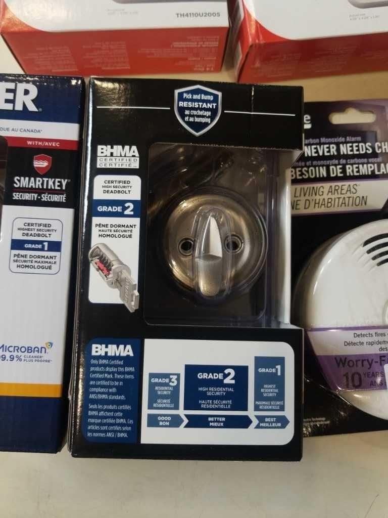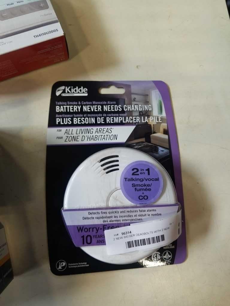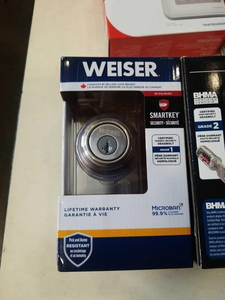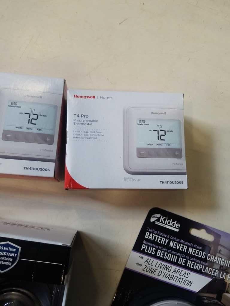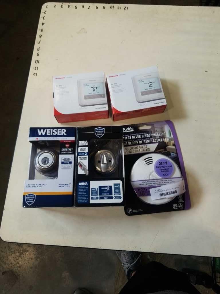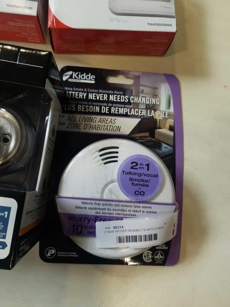 2 NEW WEISER DEADBOLTS WITH 2 NEW HONEYWELL THERMOSTATS AND KIDDE SMOKE AND CARBON MONOXIDE ALARM