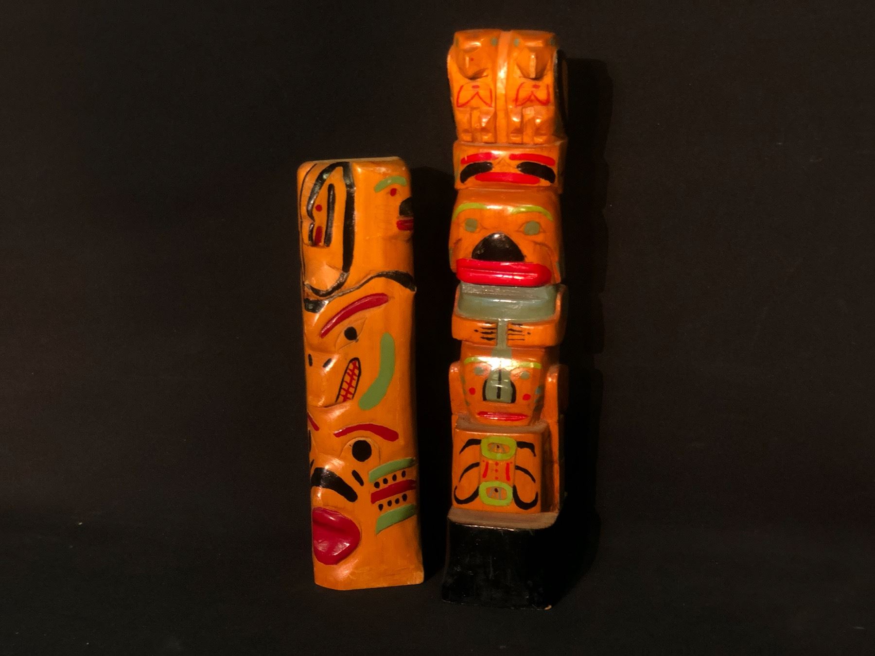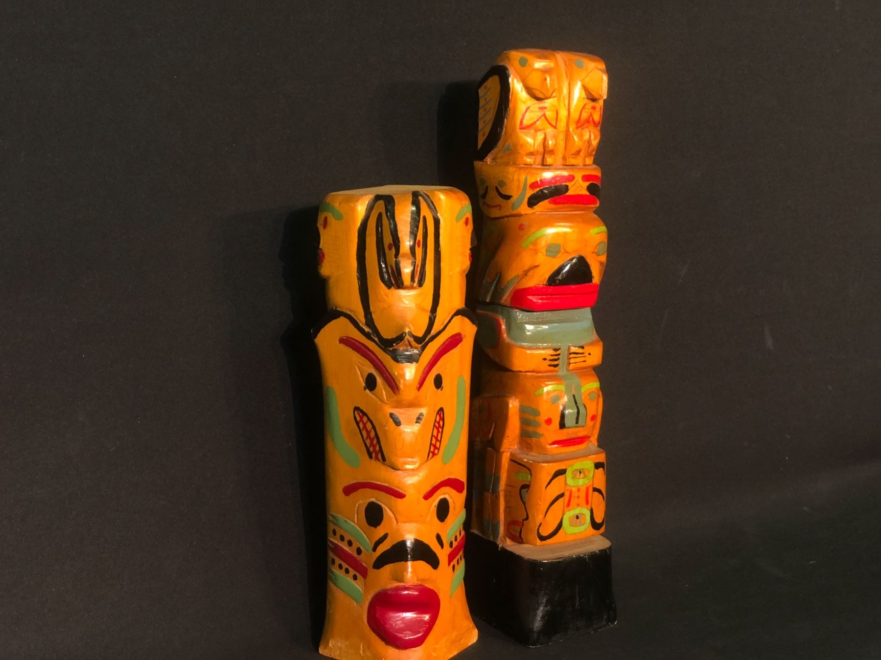 2 NORTHWEST FIRST NATIONS HAND CRAFTED AND PAINTED TOTEM POLES, 13.5" AND 17.5" TALL