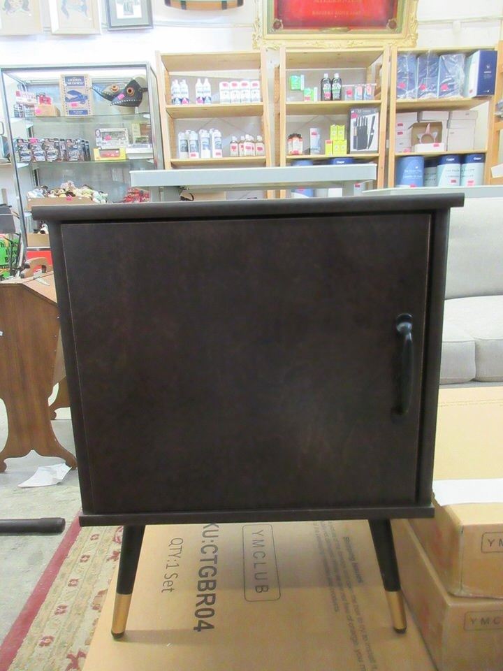 Have interior shelves. Doors can be assembled to open left or right. Metal legs and door pulls. 15" x 18" x 23" tall.