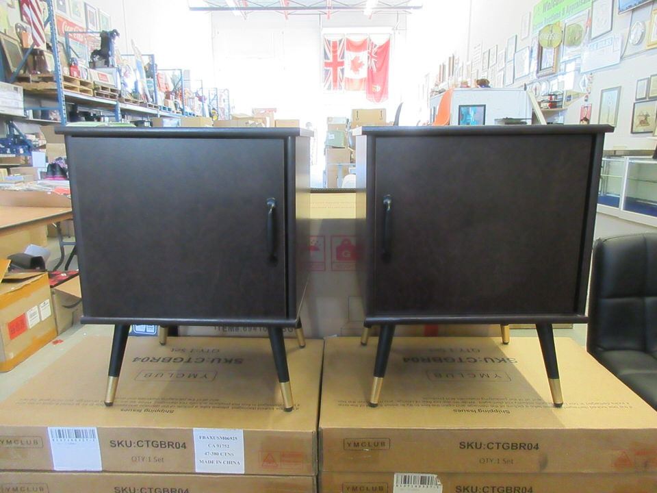 Have interior shelves. Doors can be assembled to open left or right. Metal legs and door pulls. 15" x 18" x 23" tall.