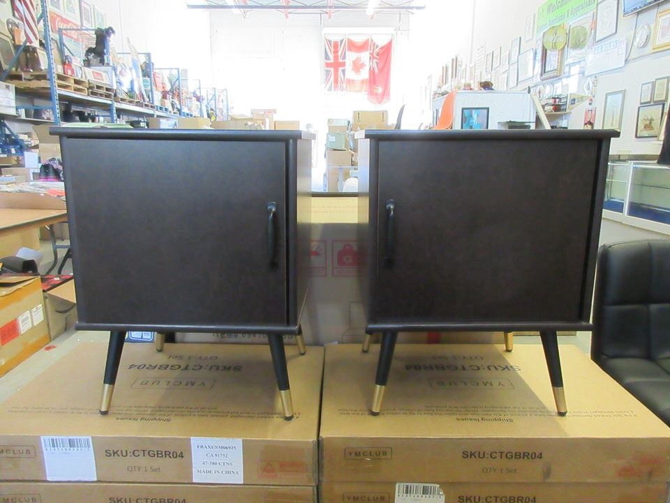 Have interior shelves. Doors can be assembled to open left or right. Metal legs and door pulls. 15" x 18" x 23" tall.