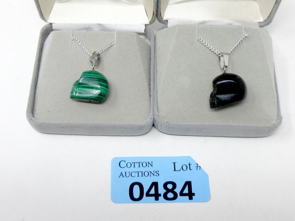 Malachite and Onyx. Skulls measure 1/2" x 3/4" and have 18" chains