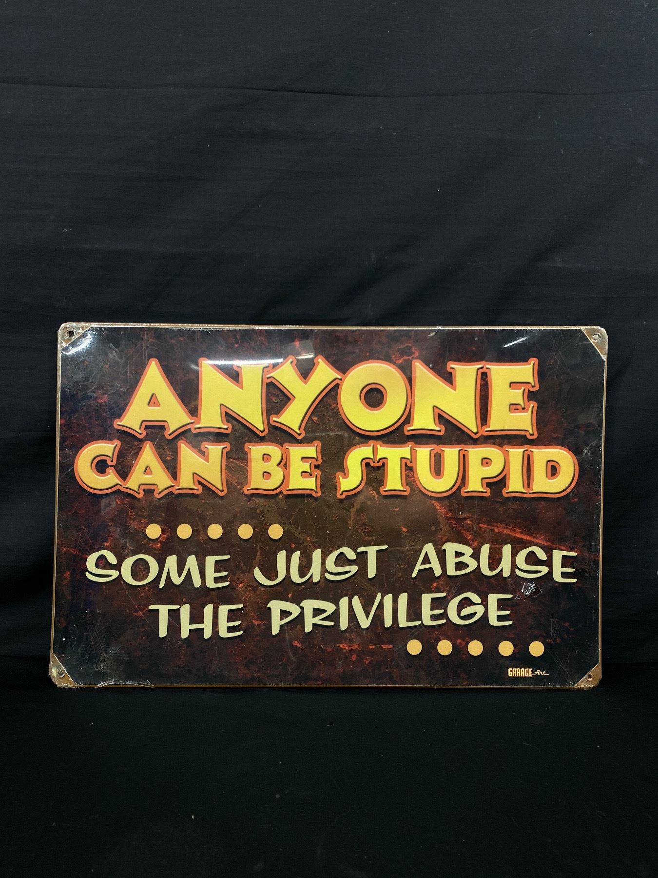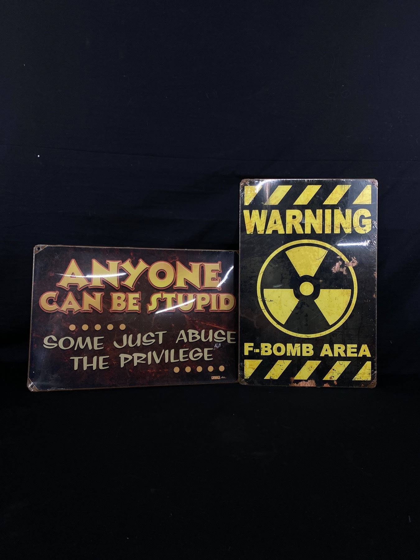 2 New Large "Warning" & "Anyone Can Be Stupid" Metal Signs. Each Approx. 11 1/2" x 17 1/2"