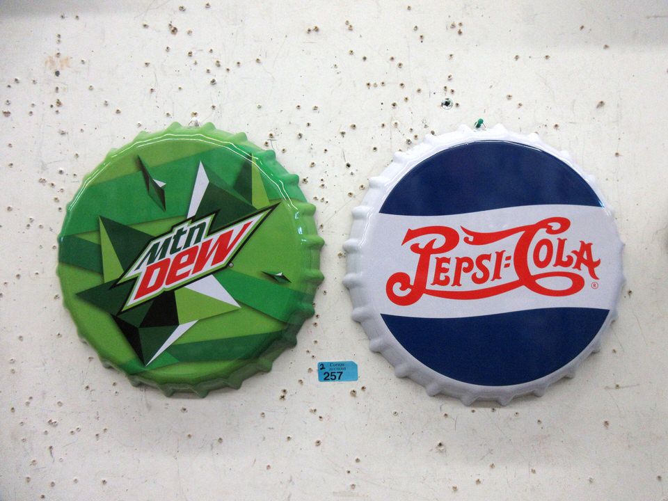 One 14" Mountain Dew and one 14" Pepsi- Cola bottle cap signs.
