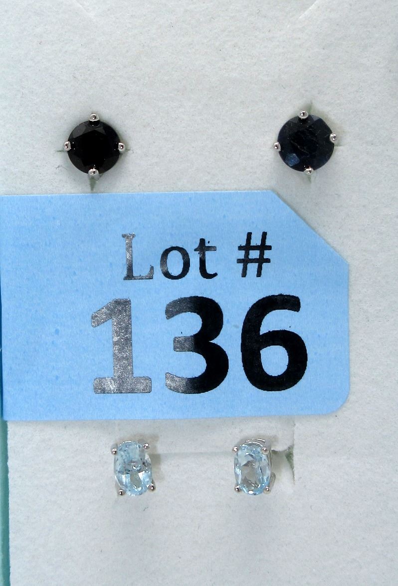One pair of round sapphire earrings & one pair of oval blue topaz earrings.