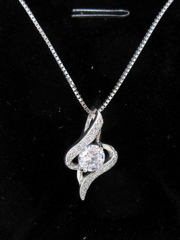 Cubic Zirconia. 12mm x 20mm pendant on a fine 18" box link chain. Includes gift boxes