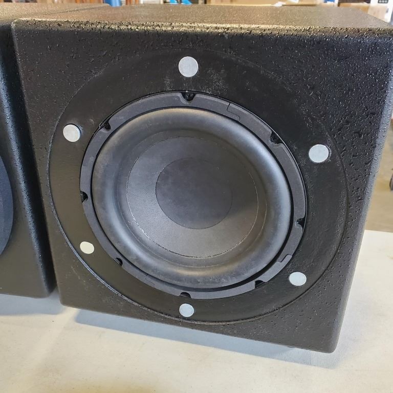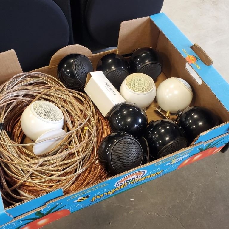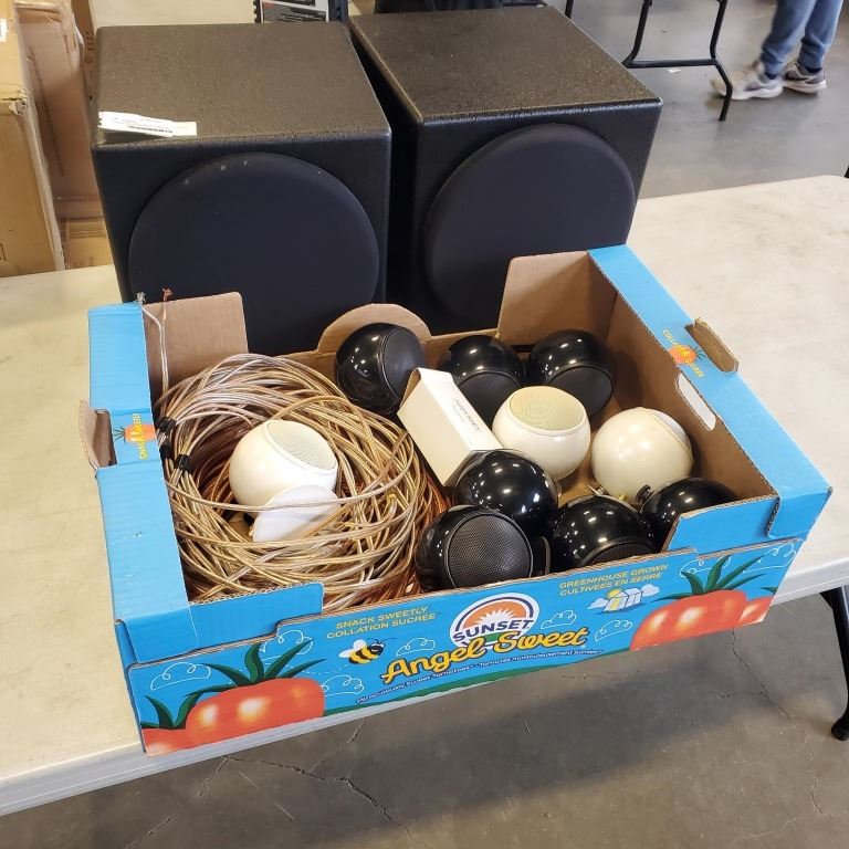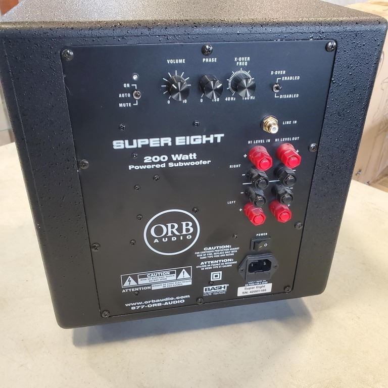 2 ORB AUDIO SUBS AND 10 ORB AUDIO SURROUND SPEAKERS AND LARGE ROLL OF SPEAKER WIRE