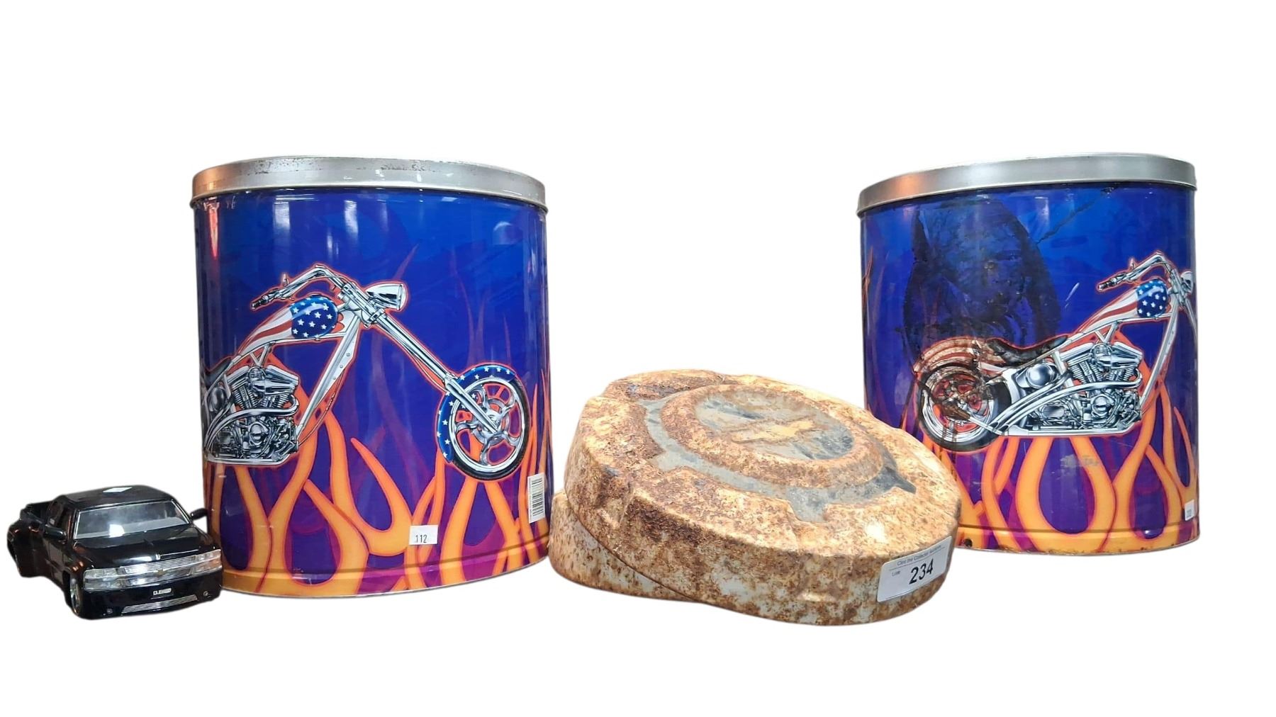 2 Orange County Chopper tins (large), 2 Chev hubcaps & 1:24 die cast 99 Silverado