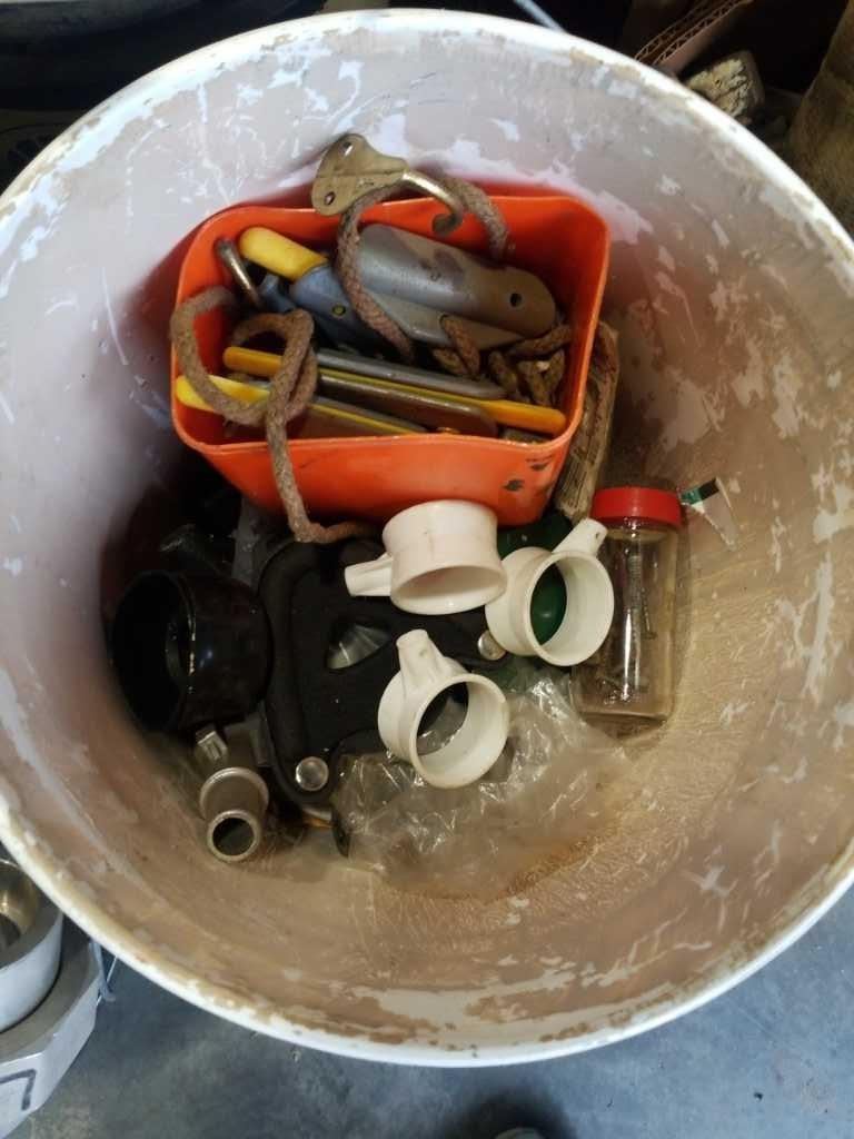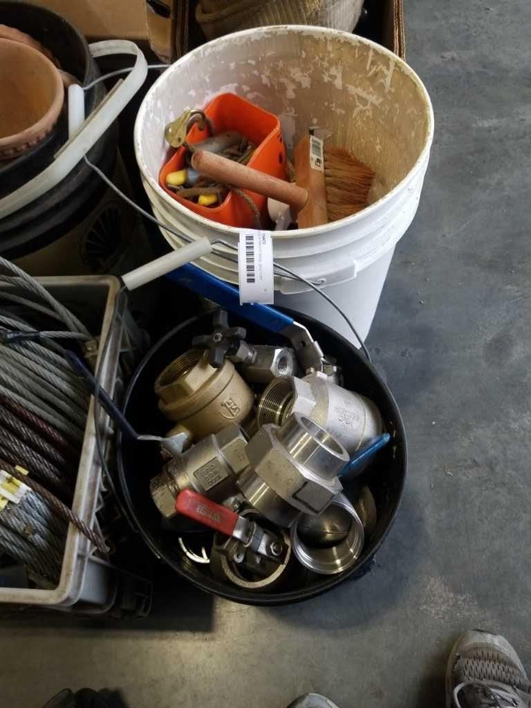 2 PAILS OF PIPE FITTINGS, SHUTOFF VALVES, SHOP SUPPLIES